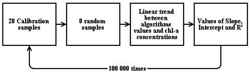 To conduct models calibration, we used a Monte Carlo simulation (Figure 3): eight samples were randomly selected and used to calibrate the algorithms with a linear trend between model values and chl-a concentrations. This process was repeated 100,000 times. The resulting values of slope, intercept and determination coefficient (R2) were recorded for each iteration.