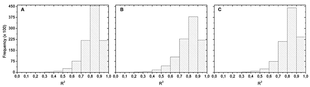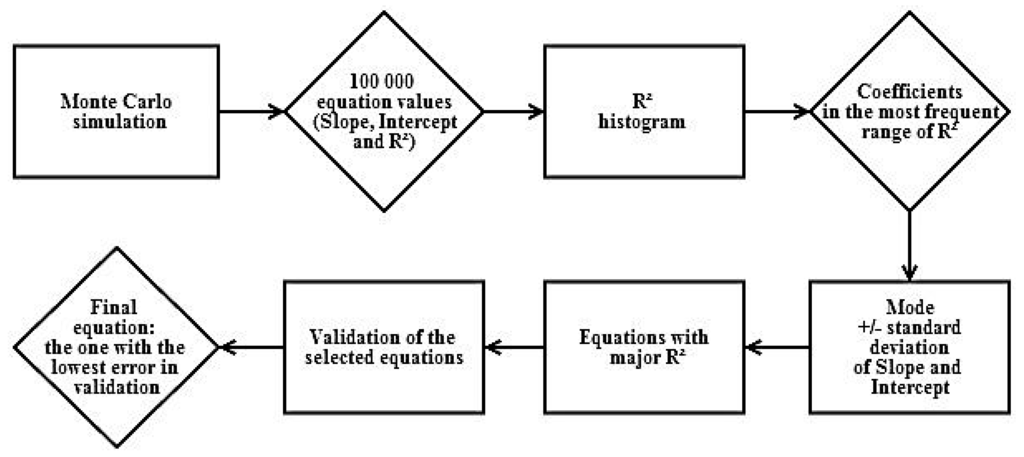 Figure 6 shows the R2 histograms from Monte Carlo simulation. The most frequent R2 range was between 0.8 and 0.9. Within this range, we chose the best equation of the validation with the maximum R2. That is why Table 4 only exhibits R2 equals 0.9.