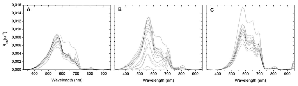 RRS spectra from Funil reservoir in: (A) May 2012; (B) September 2012 and (C) April 2013.