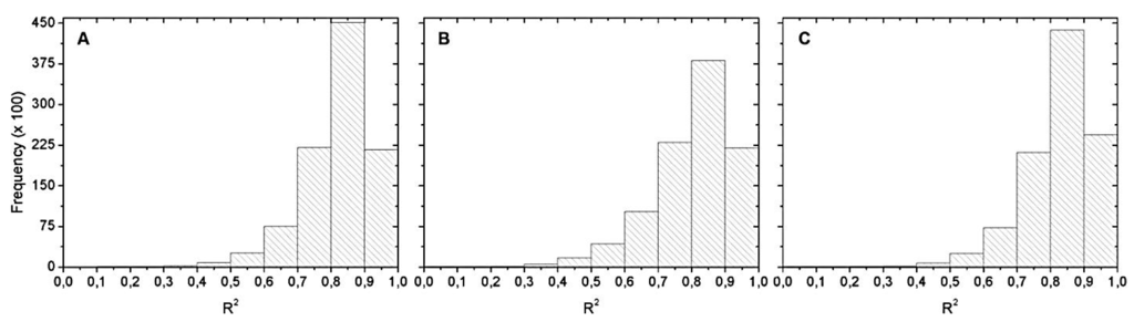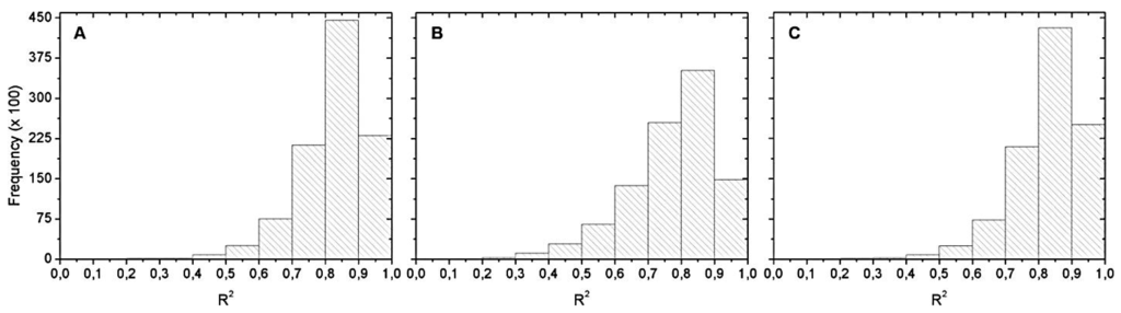 Histograms of the R2 distribution for: (A) May 2012; (B) September 2012; and (C) April 2013. Hyperspectral data with chl-a values below 20 µg∙L−1.