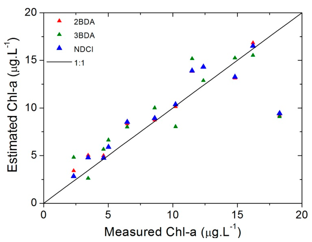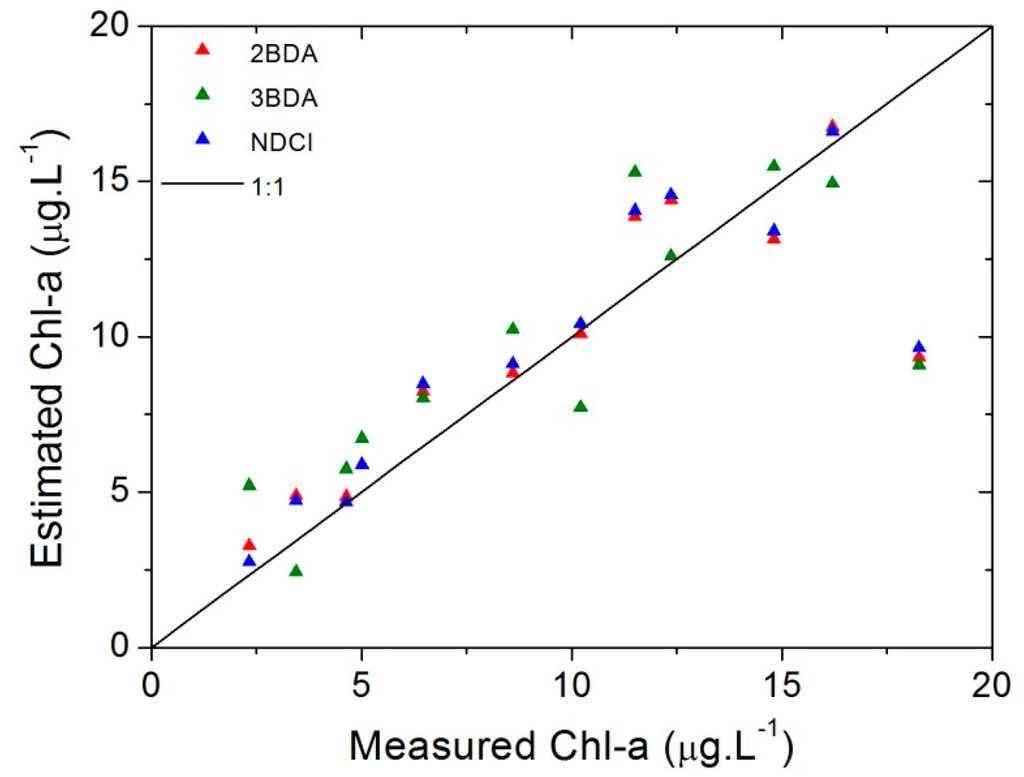 Using chlorophyll-a concentration and hyperspectral data with concentration below 20 µg∙L−1, the two band model (2BDA) proposed by Gitelson [19] had a low Normalized Root Mean Square Error in percentage (NRMSE% = 18.32%) and a negative intercept; and the Normalized Difference Chlorophyll Index (NDCI) proposed by Mishra and Mishra [12] had the lowest NRMSE% (17.85%).