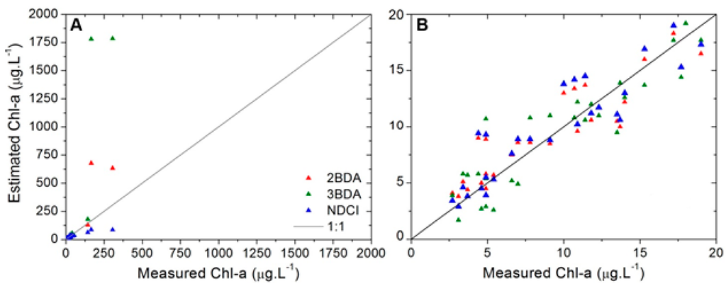 Without restraining chl-a concentration, the Root Mean Square Error (RMSE) increased more than 300%, 1000% and 1500% for 2BDA, 3BDA (three band model proposed by Gitelson et al. [36]) and NDCI, respectively. This indicates that applying the same algorithm for a dataset with normal and bloom conditions can increase the errors of the chlorophyll-a estimation.