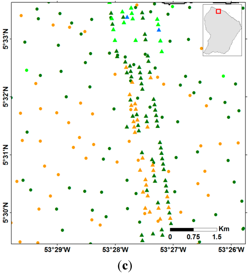 - Gond, V.; Freycon, V.; Molino, J.-F.; Brunaux, O.; Ingrassia, F.; Joubert, P.; Pekel, J.-F.; Prévost, M.-F.; Thierron, V.; Trombe, P.-J.; et al. Broad-scale spatial pattern of forest landscape types in the Guiana Shield. Int. J. Appl. Earth Obs. Geoinf. 2011, 13, 357–367. [Google Scholar] [CrossRef]