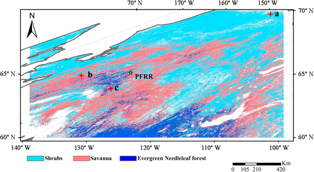 Demonstration of the study area and land-cover types derived from MODIS data. PFRR denotes our investigation site, Poker Flat Research Range, and a, b, and c indicate the locations of pixels selected as examples of shrubs, savanna, and evergreen needleleaf forest, respectively (see Section 4.2 for details).