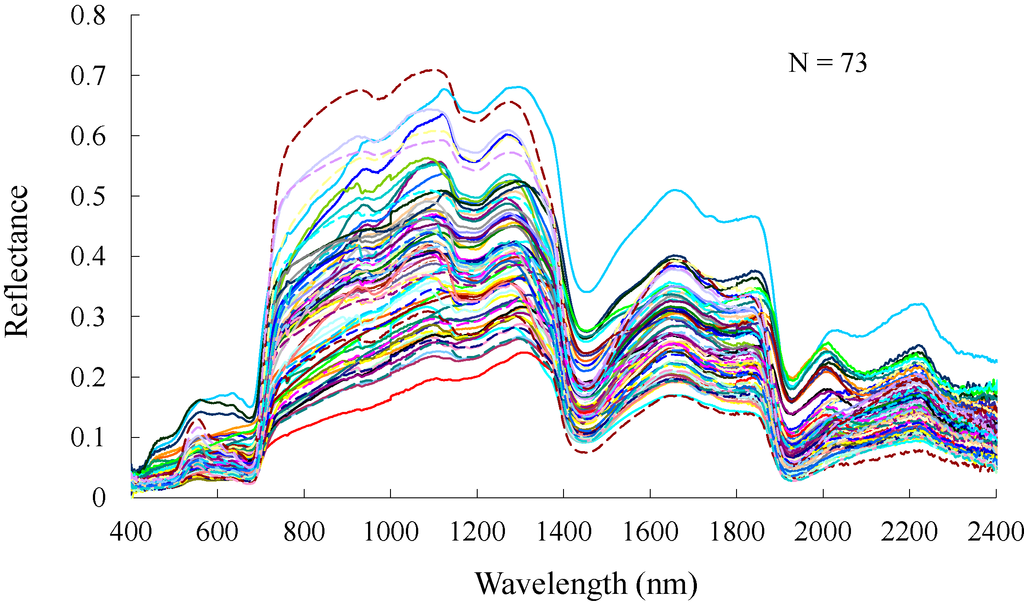 Field investigations were carried out at the Poker Flat Research Range (PFRR, 65°07′N, 147°30′W), located 50 km from Fairbanks, Alaska, USA (Figure 1) during 14–17 July 2013. We measured reflectance spectra of understory at different locations using an ASD FieldSpec 4 spectral radiometer (ASD, Inc., Boulder, CO, US) at a 1-nm interval in the range of 350–2500 nm. We used halogen light (rather than natural sunlight) because the light environment at the understory level is not homogeneous. To avoid the influence of the overstory canopy on the measurement of understory reflectance, the ambient canopies were covered by black curtains, which shut out over 99% of the natural light. Then, the halogen light incident angle was set as 45°, and the fiber probe of the FieldSpec was positioned about 50 cm above the ground and set at 0° (nadir view). The integration time was optimized before each measurement over the reference panel. Measurements were taken at four plots covered with northern reindeer lichen, tussock, blueberry, and combinations of these. In total, reflectance spectra for 73 points were collected. All measurements were done in the same way. Figure 2 shows the reflectance spectra of forest understory collected in this study. Values shorter than 400 nm and longer than 2400 nm are not included due to instrument noise. High variability in the spectra due to the noticeably distinct land-cover properties can be observed. The spectra with high reflectance in the range of 800–1200 nm represent tussock, while the low spectra represent lichen.