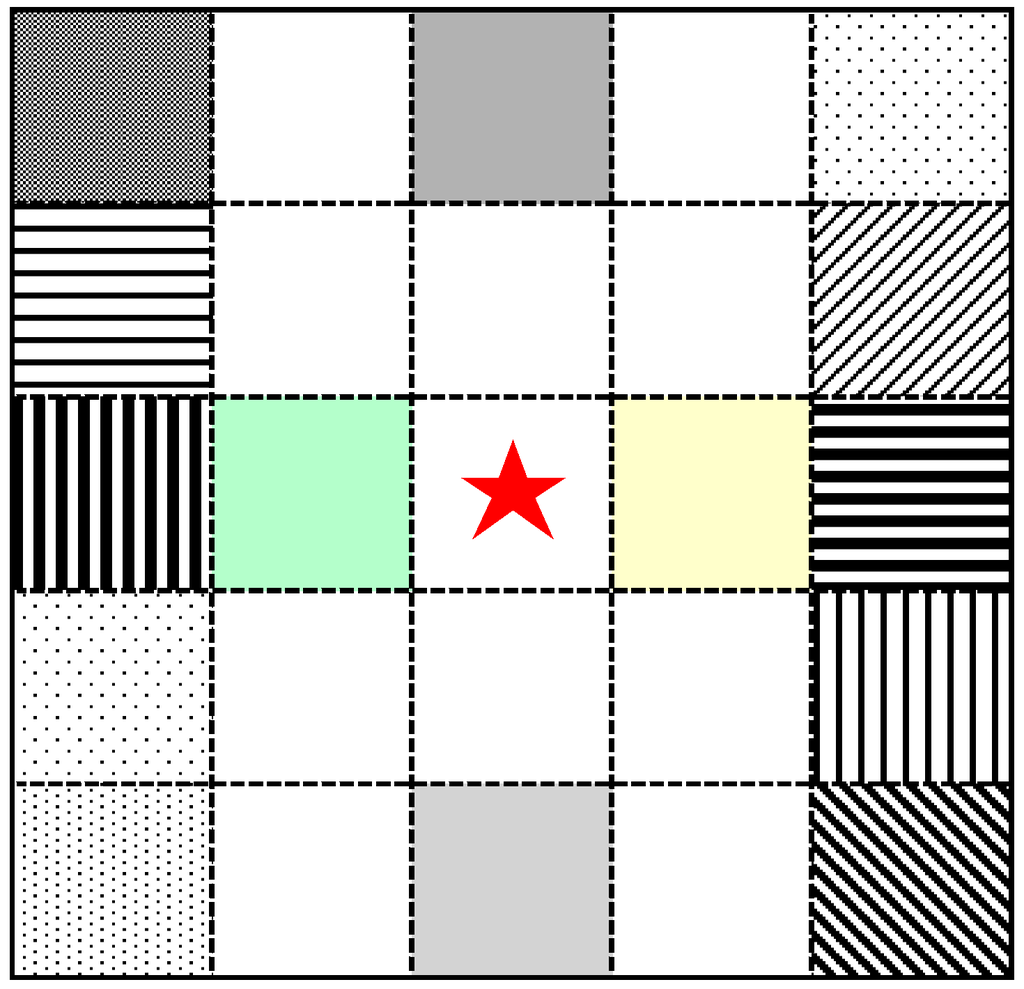 Conceptual demonstration of the method for retrieving NDVIu (5 × 5 window with the center as target pixel; only the pixels with the same vegetation type as the target pixel are used for regression analysis. Grids with different format indicate different land-cover categories).
