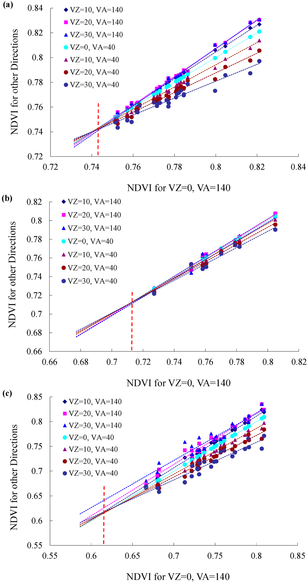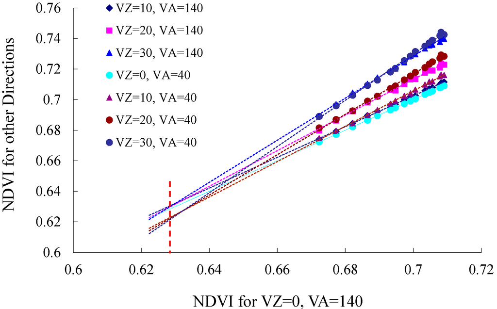 Then, we performed regression analysis among the NDVI values of the pixels corresponding to different angles, which were reconstructed from MODIS BRDF product. Linear regression was performed with the nadir-view NDVI values as the independent variable and NDVI values corresponding to other bidirectional angles as dependent factors. Having the same canopy structure but variable LAIo would make the correlations significant.