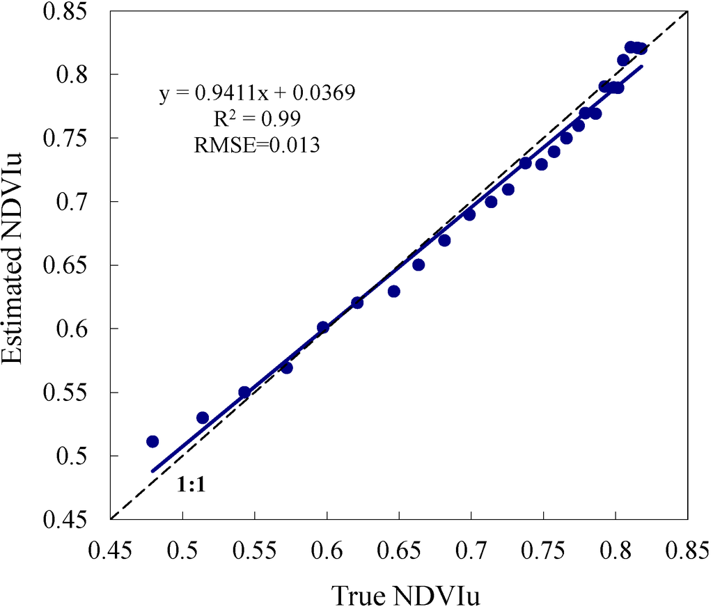Moreover, Figure 5 shows the comparison between the true NDVIu (i.e., the NDVI for the stands with LAIo = 0) and the retrieved NDVIu by our proposed method. For all the samples, the input values of LAIu in the FLiES simulation ranged from 0 to 2.5 with an interval of 0.1. Thus, there are 26 points in total. It can be seen that the estimated values are highly consistent with the true values, with R2 and RMSE of 0.99 and 0.013 and the slope and intercept very close to “1” and “0”, respectively. This is an idealized case without contamination caused by measurement errors, and the simulated conditions totally satisfy the basic assumptions of the proposed method. The high accuracy of the retrieval results demonstrates that the proposed method is theoretically reasonable.