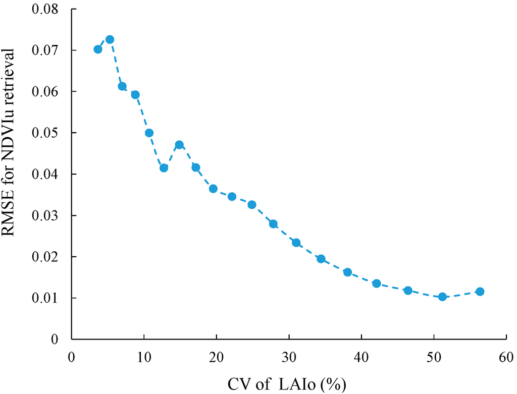 An important prerequisite of our method is that the LAIo of samples used for regression analysis have a reasonable dynamic range. By using the simulation data set, we tested the influence of the dynamic range of LAIo on the accuracy of NDVIu retrieval. We used groups of samples with different values for the coefficient of variation (CV; defined as the ratio of the standard deviation to the average) for LAIo to retrieve NDVIu. The corresponding root-mean-square-error (RMSE) for each level of CV was also calculated (Figure 6). As predicted, the RMSE decreases when the CV of LAIo increases. When CV is beyond 40%, the RMSE becomes stable and lower than 0.015.
