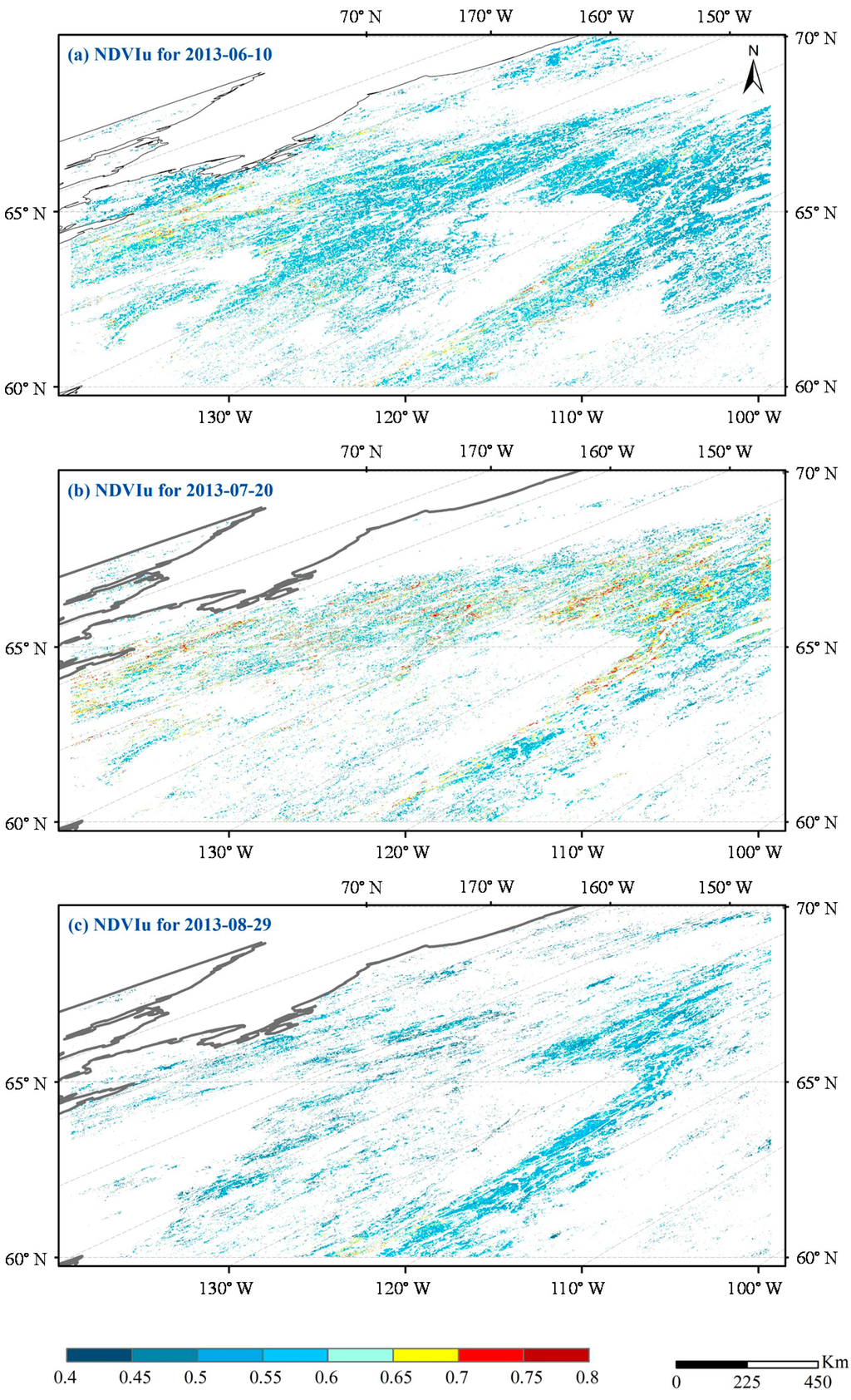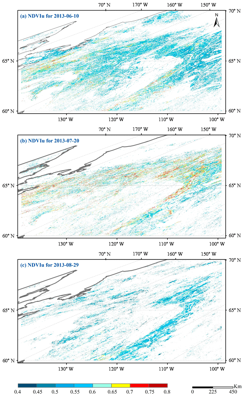 Figure 8 shows three examples of the spatial distribution of NDVIu retrievals for 10 June, 20 July, and 29 August 2013, respectively. As stated above, we did not obtain valid retrieval of NDVIu for each pixel due to the use of quality-filtering criteria. The percentages of pixels with valid NDVIu retrievals were 26.16%, 15.61%, and 10.24% for the three periods, respectively. The retrieved values of NDVIu showed remarkable seasonal variability. In late spring (10 June, Figure 8a), most of the NDVIu values were 0.45–0.55, whereas in mid-summer (20 July, Figure 8b), the NDVIu increased to 0.6–0.75. Then, at the end of summer (29 August, Figure 8c), the NDVIu decreased to 0.45–0.55.