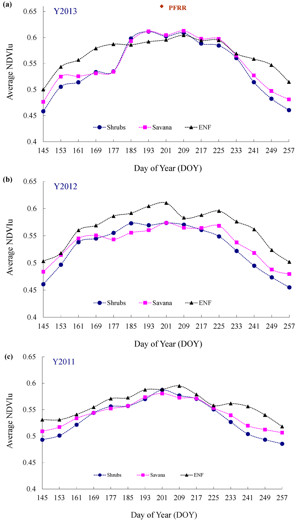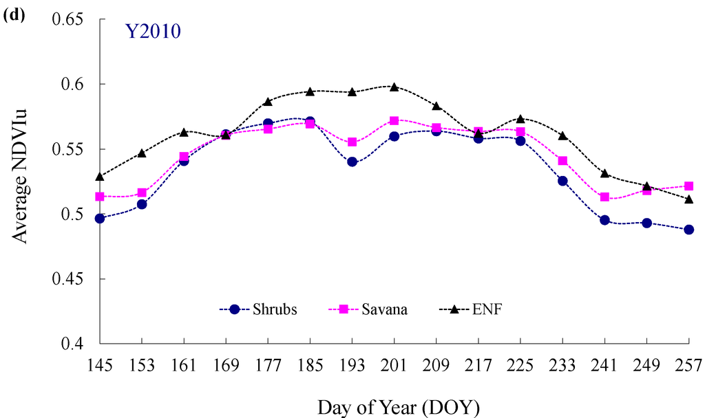 Furthermore, we calculated the average NDVIu for the biome types shrubs, savanna, and ENF for DOY from 145 to 257 in 2010–2013 (Figure 9). The average in situ understory NDVI measured at PFRR, whose biome type in July 2013 was savanna, according to IGBP land-cover biome classification, is also shown in Figure 9a. The in situ NDVIu average was 0.66 with an SD of 0.12, comparable to the MODIS retrieval closest to the investigation date for savanna, whose average was 0.61, with an SD of 0.10. It should be noted that the BRDF product did not yield a valid NDVIu retrieval value for the pixel covering PFRR mainly because of the low data quality. Therefore, we cannot perform a standard comparison of the in situ measurement and the retrieval from satellite data. However, the small discrepancy (0.66 ± 0.12 vs. 0.61 ± 0.10) suggested that the retrieved NDVIu yielded an acceptable range for the NDVI values for the forest understory. Moreover, the times series of the retrieved NDVIu for each biome in each year showed an increasing trend from Spring to Summer, and then a decreasing trend from Summer to Autumn (Figure 9). This is completely consistent with the phenology pattern of grass within the study area.