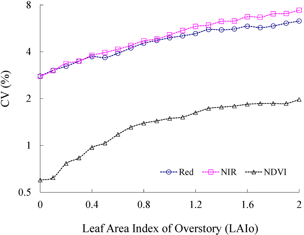 To validate this property, we utilized a simulation data set, as delineated in Section 4.1. The CV of BRF at red and NIR bands and NDVI corresponding to the eight solar-view angles were calculated (Figure 10). It can be seen that all of the CV curves for the two bands and the corresponding NDVI show an increasing trend when LAIo increases. In other words, the stand with LAIo = 0 has the smallest angular variation among the stands having LAIo in the range 0–2.0. Consequently, we may consider that the NDVI values also have the smallest variation when the stand has LAIo = 0. It should be noted that all the demonstrated samples were had LAIu values >0.5; therefore, the CV corresponding to LAIo = 0 is not zero.
