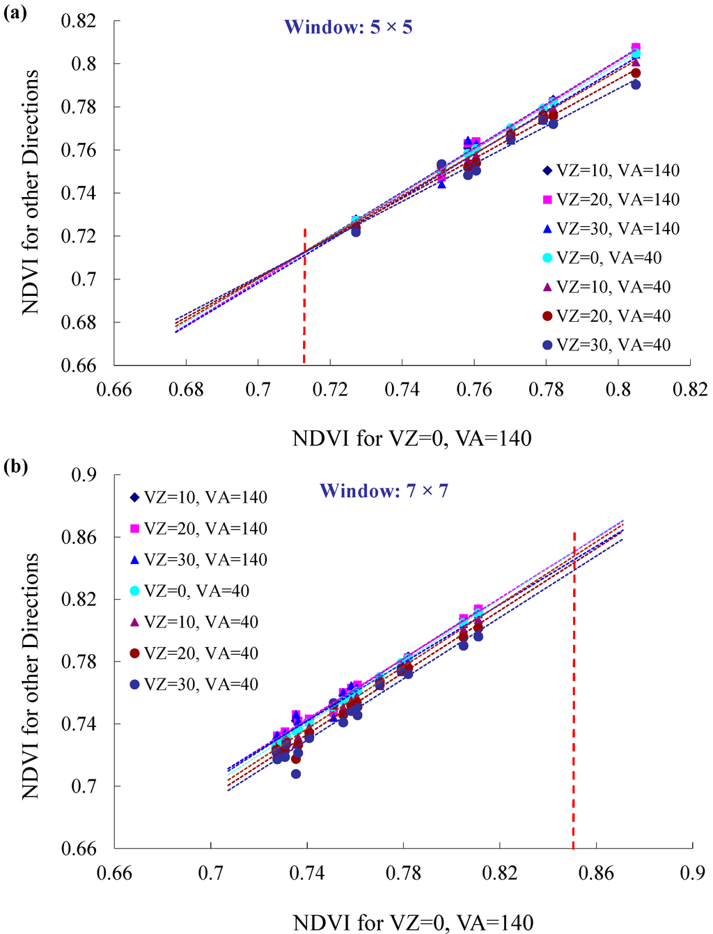 In this study, the window size is determined through a trial-and-error approach. We manually tested the effect of window size on the retrieval of NDVIu, including window sizes of 3 × 3, 5 × 5, and 7 × 7. Figure 11 shows an example, based on the case shown in Figure 7b, of how the window size affects the retrieval of NDVIu. For the 3 × 3 window, only five pixels were valid for regression analysis. Thus, it was discarded. The 5 × 5 window demonstrated acceptable performance (Figure 11a). For the case of 7 × 7 window, as shown in Figure 11b, the position at which the seven regression lines have the smallest SD is larger than the maximum NDVI within the window, which violates the premise that the stand with higher LAIo should have higher NDVI values. Consequently, we cannot obtain valid retrieval of NDVIu for this case.