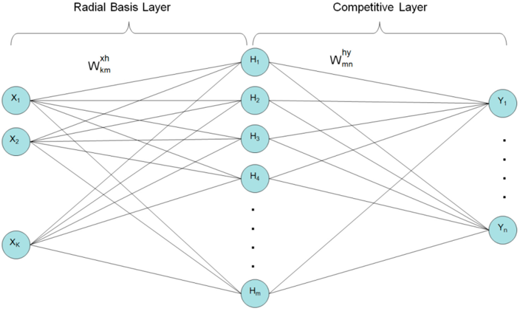 The probabilistic neural network (PNN) proposed by Specht [30] is a network based on the Bayesian network and kernel Fisher discriminant analysis [31]. It consists of three layers: the input layer, the radial basis layer and the competitive layer. The radial basis layer uses radial basis function to measure the distance between the input vectors and row weight vectors in a weight matrix. Then, the competitive Layer works out the maximum value of these probabilities, and produces a 1 for that class and a 0 for the other classes. Compared with other artificial neural networks, such as back propagation, the PNN can provide a Bayes-optimal classification at considerably faster training speeds [32]. The structure of the PNN is briefly described in Figure 2. X, Y and H in this figure represent input variables, neurons in the output layer and neurons in the hidden layer, respectively, while the variables k, m and n are the number of input vectors, output neurons and hidden neurons, respectively.