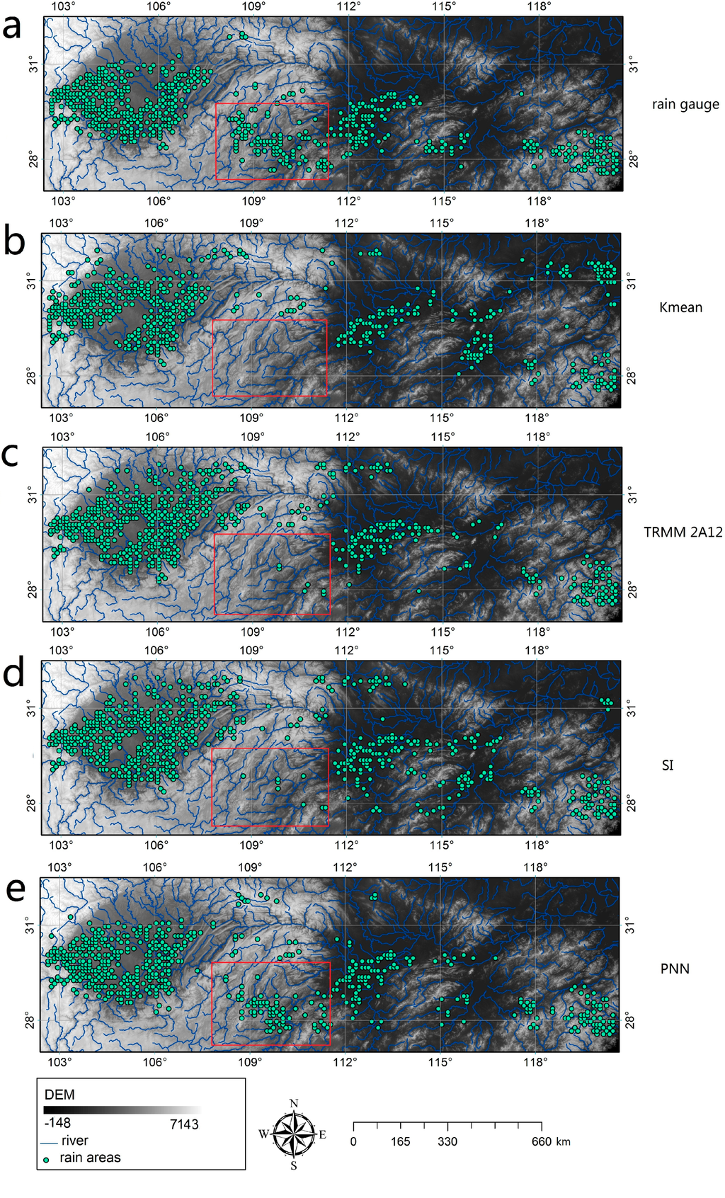 The rain event of 26 July 2009, at 9 am was taken as an example to present the results of the Kmean, TRMM 2A12, SI_threshold and PNN rain area delineation methods. Figure 3 shows the rain areas detected by rain gauge network and delineated by the Kmean, TRMM 2A12, SI_threshold and PNN, respectively. Although the rain areas shared a similar spatial pattern, there were numerous differences among them. For example, the Kmean, TRMM 2A12 and SI_threshold seriously under-estimated the rain areas in the rectangle shown in Figure 3. In contrast, the PNN can detect the rain areas in this region more accurately compared with the other three methods.