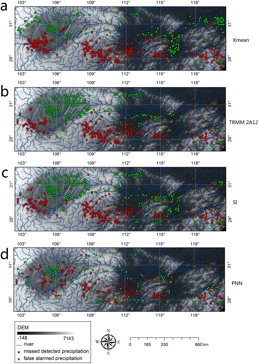 Figure 4 presents the spatial distribution of the misdetected (the red circles) and the false alarm (the green circles) precipitation of the rain area delineated by the Kmean, TRMM 2A12, SI_threshold and PNN, respectively. The false alarm precipitation of the Kmean and TRMM 2A12 was 201 and 225, while the misdetected precipitation of them was 295 and 231, respectively. The SI_threshold produced 489 misclassified precipitations, including 239 misdetected precipitations and 250 false alarm precipitations. Compared with the three rain area delineation methods mentioned above, the PNN produced the smallest amount of false alarm precipitation (129) and misdetected precipitation (180). Besides, the CSI, ETS, HK and HSS of PNN (0.63, 0.53, 0.68 and 0.69) were obviously higher than the Kmean (0.42, 0.32, 0.45 and 0.49), TRMM 2A12 (0.48, 0.35, 0.52 and 0.52) and SI_threshold (0.46, 0.33, 0.51 and 0.49). Therefore, it can be concluded that the PNN could provide more reasonable rain area delineation compared with the other three methods.