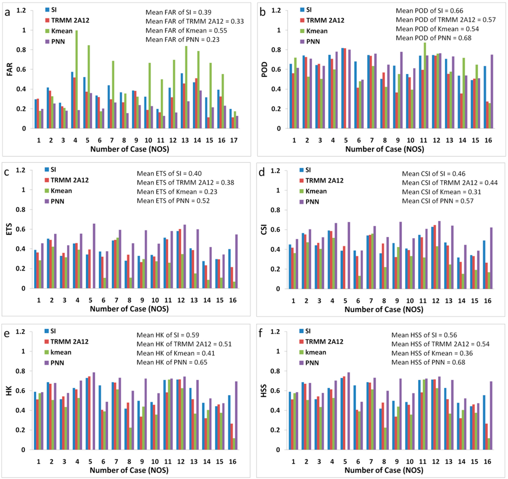 The false alarm ratio (FAR), probability of detection (POD), equitable threat score (ETS), critical success index (CSI), Hanssen and Kuiper discriminant (HK) and Heidke Skill Score (HSS) of the threshold method of the Scatter Index (SI_threshold), probabilistic neural network (PNN), TRMM Microwave Imager (TMI) Level 2 Hydrometeor Profile Product (TRMM 2A12) and dynamic cluster K-means (Kmean) using the summarized test datasets of the 16 rain events.