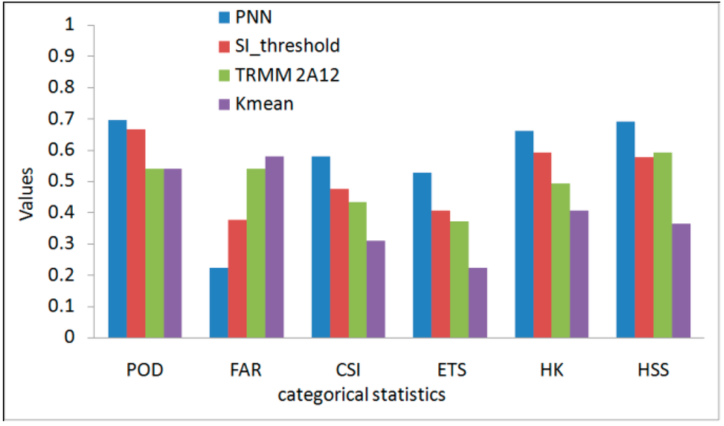 In this study, 16 rain events over the Yangtze River Basin through June, July and August 2009, were observed by the rain gauge network. The detailed information of these rain events is presented in Table 2. In this section, the results of the PNN-based rain area delineation method (termed PNN) were validated by calculating six categorical statistics described in Section 2.2.3.