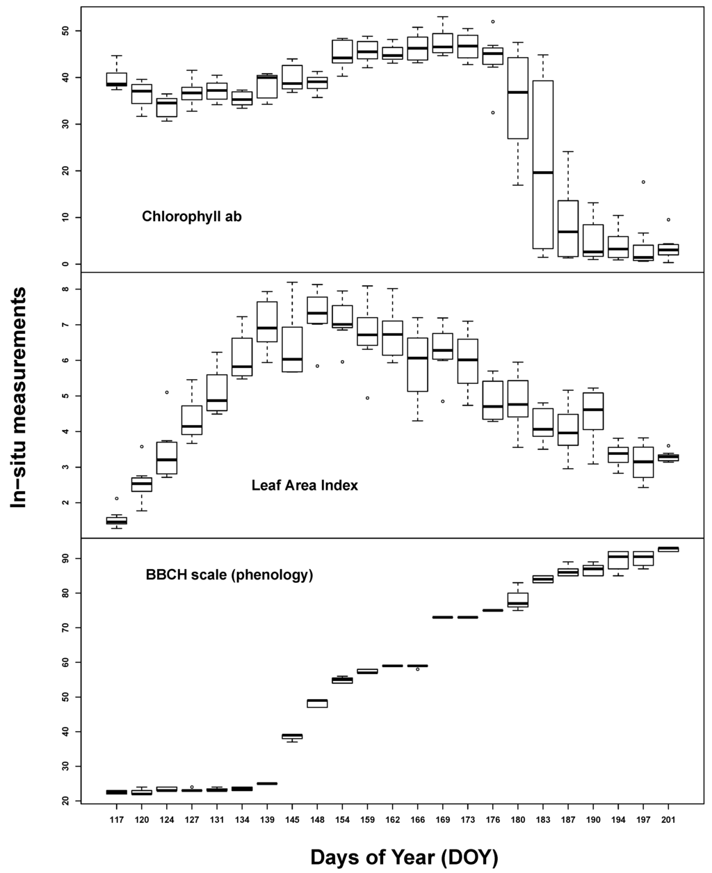 Temporal plant biophysical properties were dominated by plant phenology. While there was also some effect of the different implemented water treatments at the end of the measurement period, soil influence seemed to be almost negligible. All in situ measurements varied considerably over the course of the seasonal evolution (see Figure 1). Chlorophyll content was high throughout the early to middle growing stages (35–45 µg/cm2) until the start of ripening. LAI steadily increased up to 7 m2/m2 until ear appearance, followed by slow, steady decline. BBCH measurements covered most of the barley macro-stages: tillering (20–29), stem elongation (30–39), ear appearance (40–49), heading (50–59), flowering (60–69), fruit development (70–79), fruit ripening (80–89) and senescence (90+).