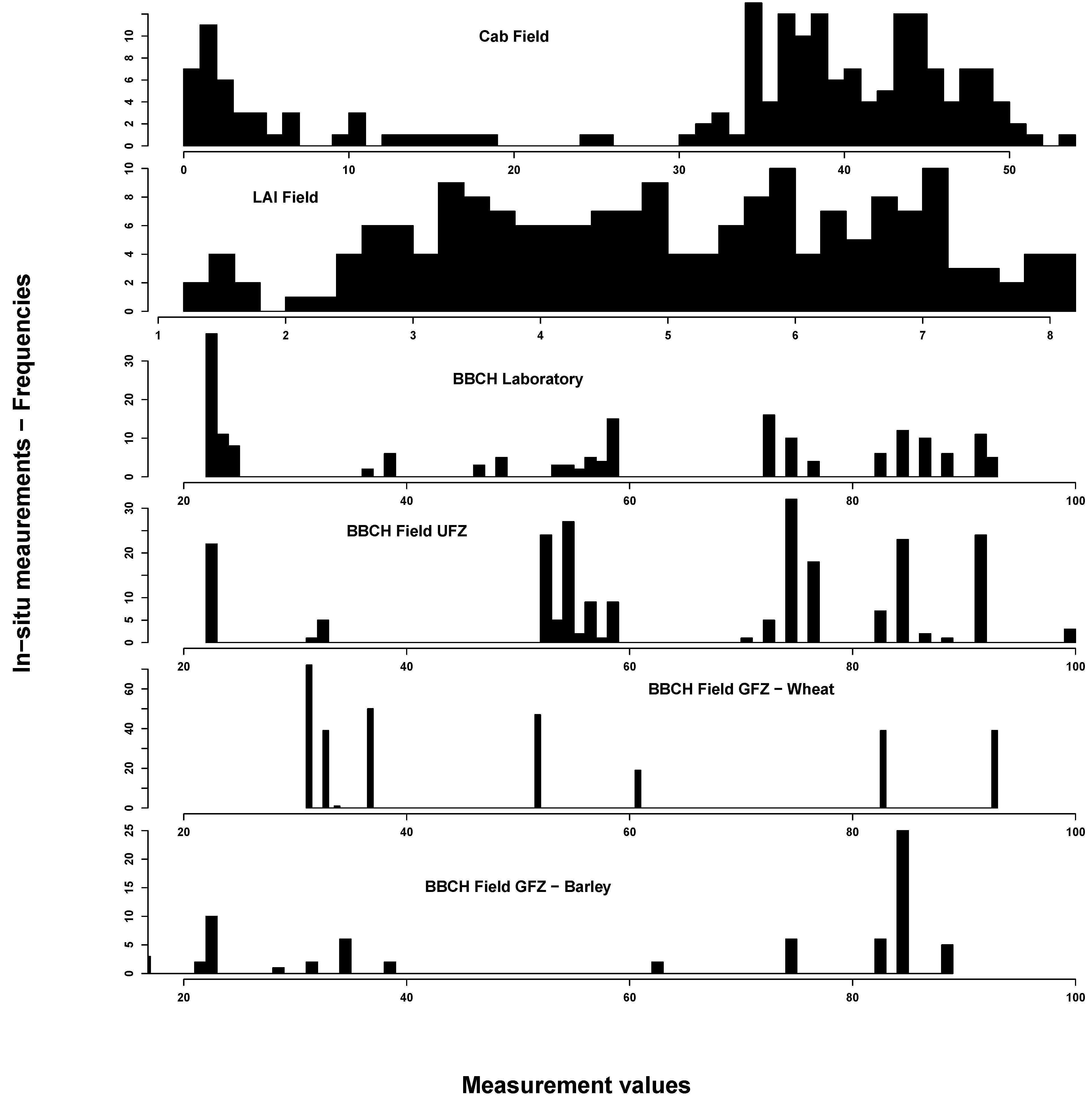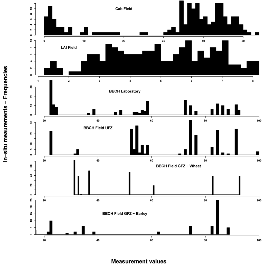 In situ measurements exhibited the spectrum of eco-physiological values for chlorophyll, LAI and BBCH, considering that most of the vegetation period was covered by measurements (see Figure 2). Most Cab values could be found around 40 and around 5 µg/cm2. This reflects the typical bimodal Cab distribution over a crop vegetation period with moderate to high values until the start of ripening and subsequent very low values. LAI was normally distributed between 1 and 8 m2/m2. BBCH measurements covered most of the macro-stages. There were, however, some differences between GFZ and UFZ measurements: GFZ measurements did not include BBCH stages below 30 and between 62 and 82 for wheat, but generally more measurements between BBCH 30 and 40.