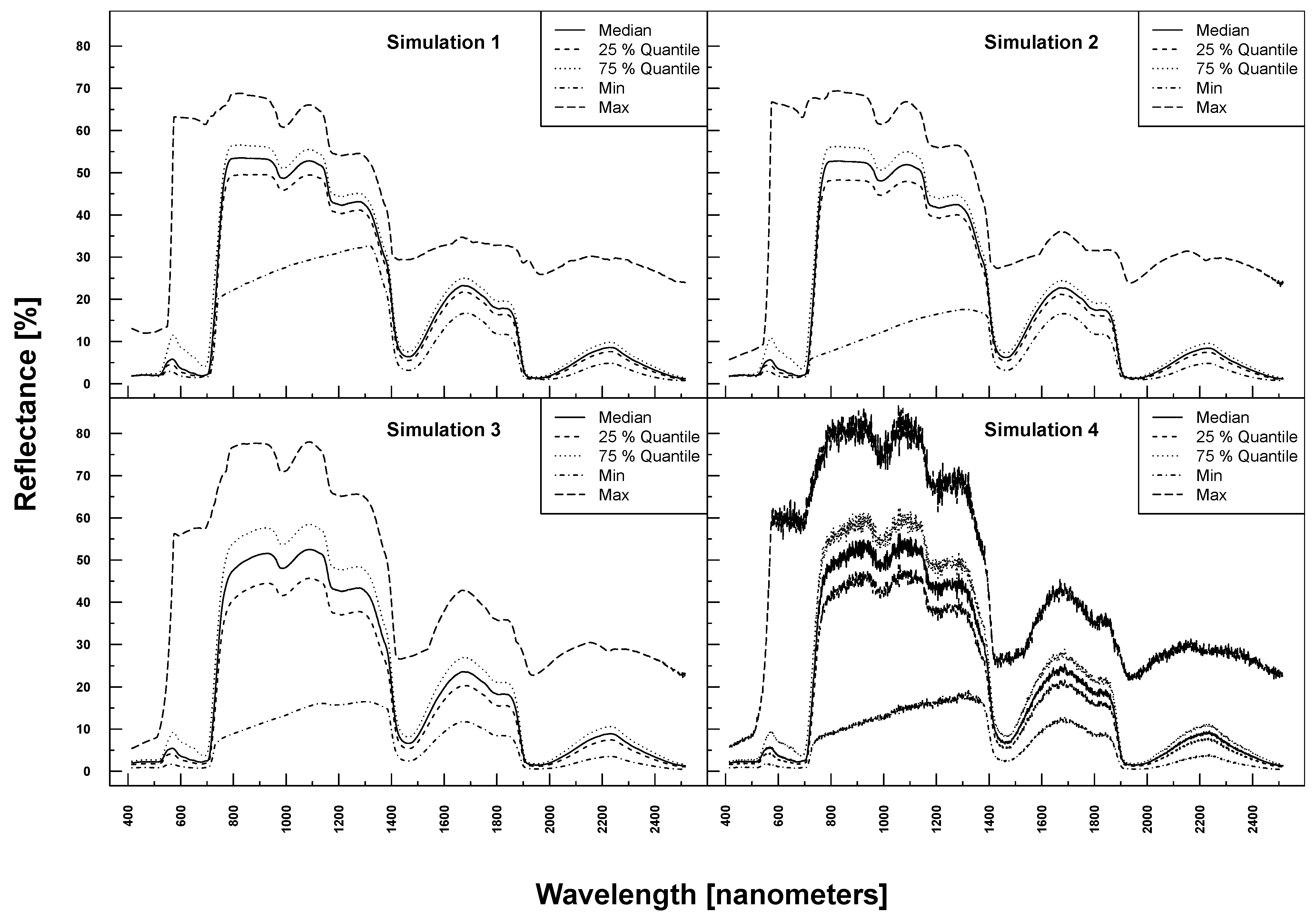 PROSAIL simulated spectral profiles (summary statistics over 10,000 simulations). Variation of basic biophysical and structural parameters (Simulation 1) (top left), variation of additional soil parameters (Simulation 2) (top right), variation of all parameters (Simulation 3) (bottom left) and variation of all parameters + additional noise and bias (Simulation 4) (bottom right).