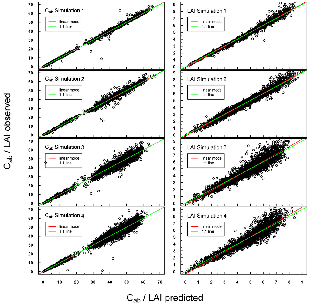 Predicted vs. observed Cab/LAI values for PROSAIL Simulations 1–4 were highly positively linearly correlated (see Figure 4). Scattering increased slightly for Simulations 3 and 4, especially at higher LAI values. A small offset could be detected for LAI Simulations 3 and 4.