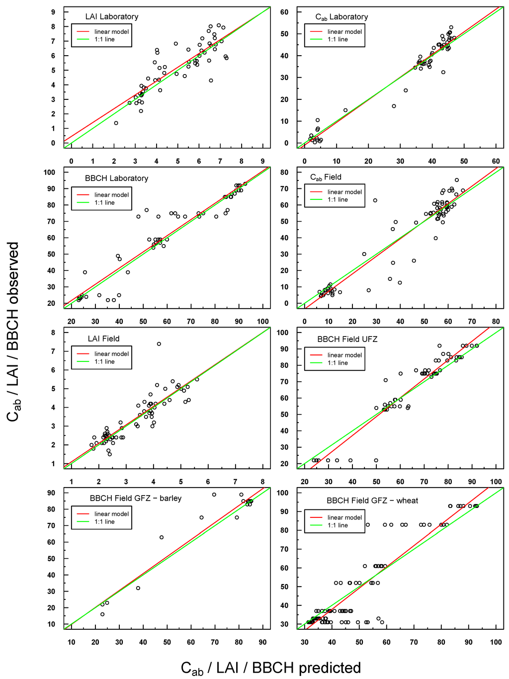 Scatterplot of predicted vs. observed values for all laboratory and field in situ measurements (Cab, LAI, BBCH). The respective linear regression model is indicated with a red line and the “ideal” 1:1 relationship with a green line. In the case of a congruent linear regression and a 1:1 line, the former is superimposed by the latter.