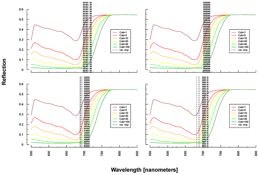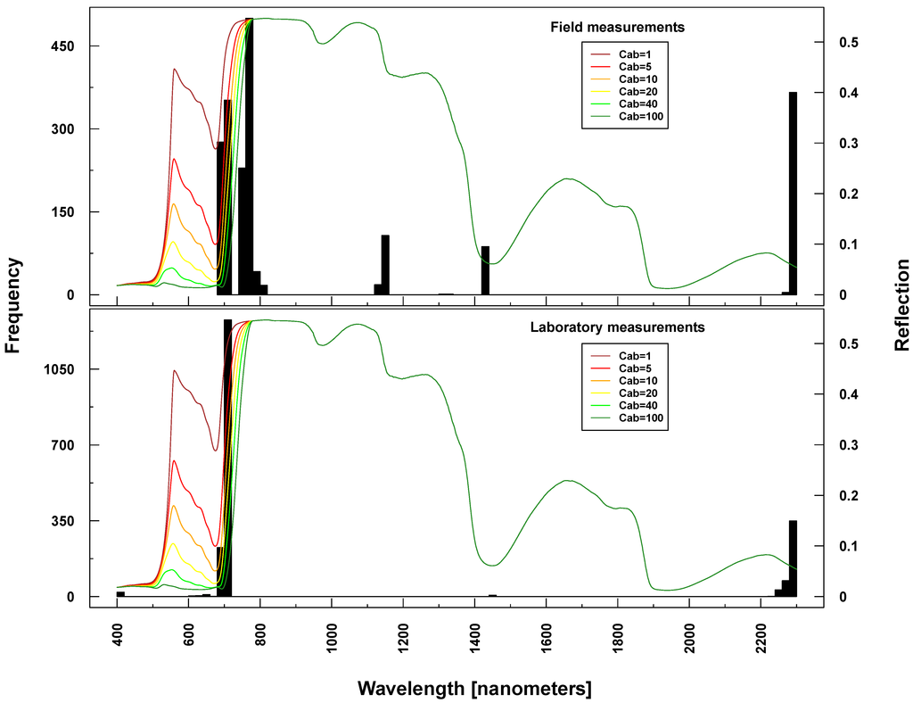 Selected important wavelengths for Cab prediction originated consistently from the VIS and red edge (rapid reflectance change of vegetation in the NIR), covering the spectral regions between 680 and 810 nm (vertical lines or bars in Figure 6 and Figure 7). This is the spectral region that is most affected when changing Cab parameters values in PROSAIL simulations (colored lines in respective Figures). In the case of ASD measurements, also wavelengths at 2300 nm (laboratory and field) and at 1150/1430 nm (field only) were selected (Figure 7), where changing Cab content has little or no influence on simulated spectra according to PROSAIL.