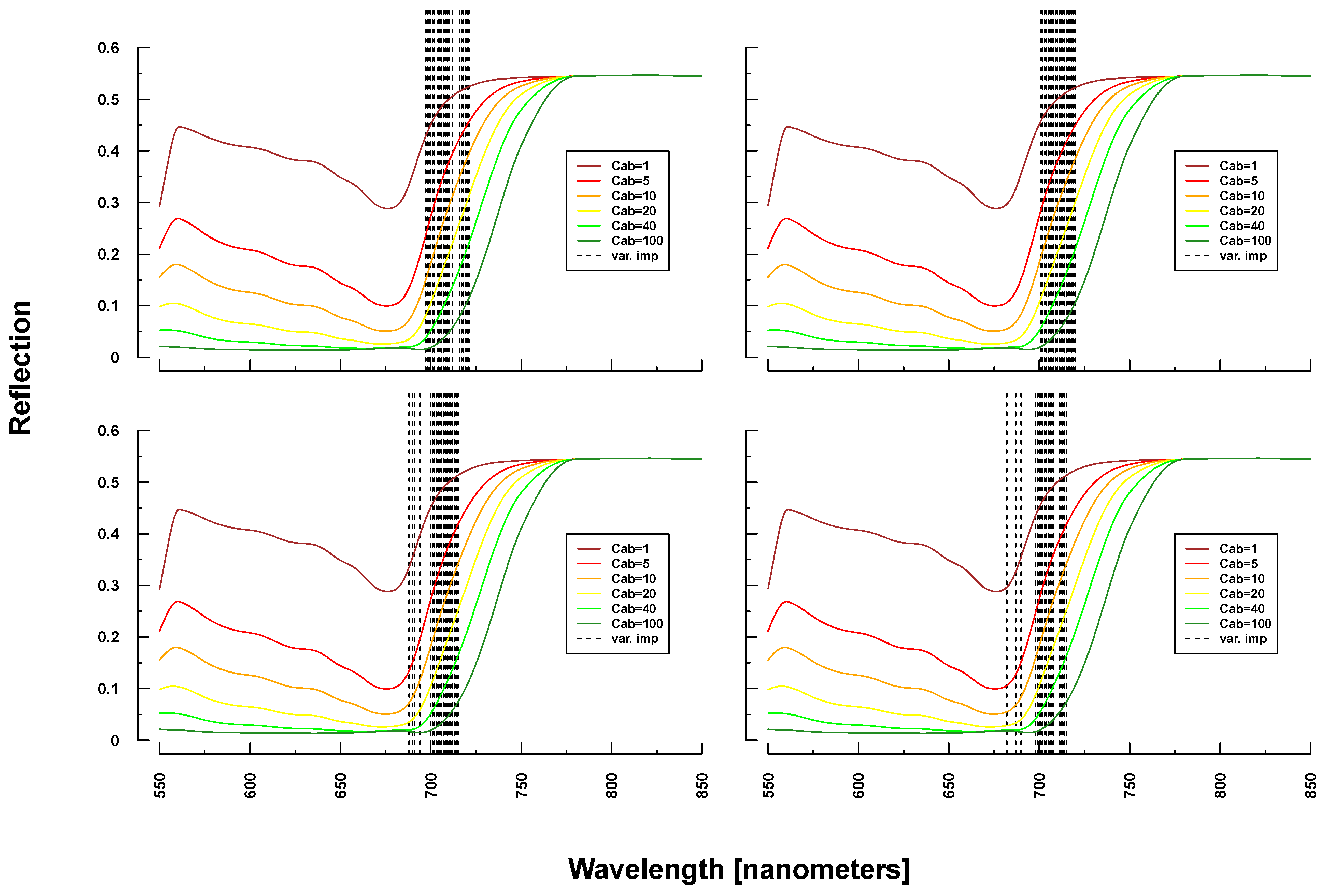 Identified important wavelengths (according to RF) for predicting chlorophyll content based on PROSAIL simulations. A single run was performed with a randomly selected training dataset. Identified important wavelengths are plotted as vertical lines. Colored lines indicate PROSAIL simulated spectral profiles with changing Cab parameterization between 1 and 100 g/m2 (y-axis). For all simulations, the same spectraare plotted. Variation of basic biophysical and structural parameters (Simulation 1) (top left), variation of additional soil parameters (Simulation 2) (top right), variation of all parameters (Simulation 3) (bottom left)and variation of all parameters + additional noise and bias (Simulation 4) (bottom right).