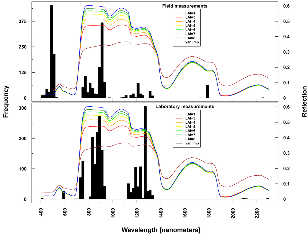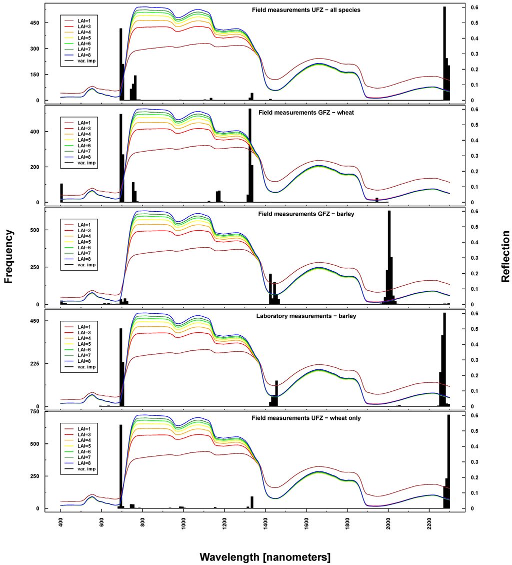 Consequently, one would expect that the selection of important variables for estimating chlorophyll and LAI refers to the spectral regions mentioned above. Overall, selected wavelengths for Cab and LAI correspond well with the above-mentioned sensitivity analysis conducted by [38,39], independent of whether simulated, laboratory or field data were used. Bands considered to be most important for modeling Cab were very similar to those identified in simulated data. LAI prediction was primarily based on wavelengths in the NIR and SWIR, spectral regions dominated by the vegetation’s structural components [15,23]. Wavelengths considered to be most important by RF corresponded well with the findings of other studies [37,40].