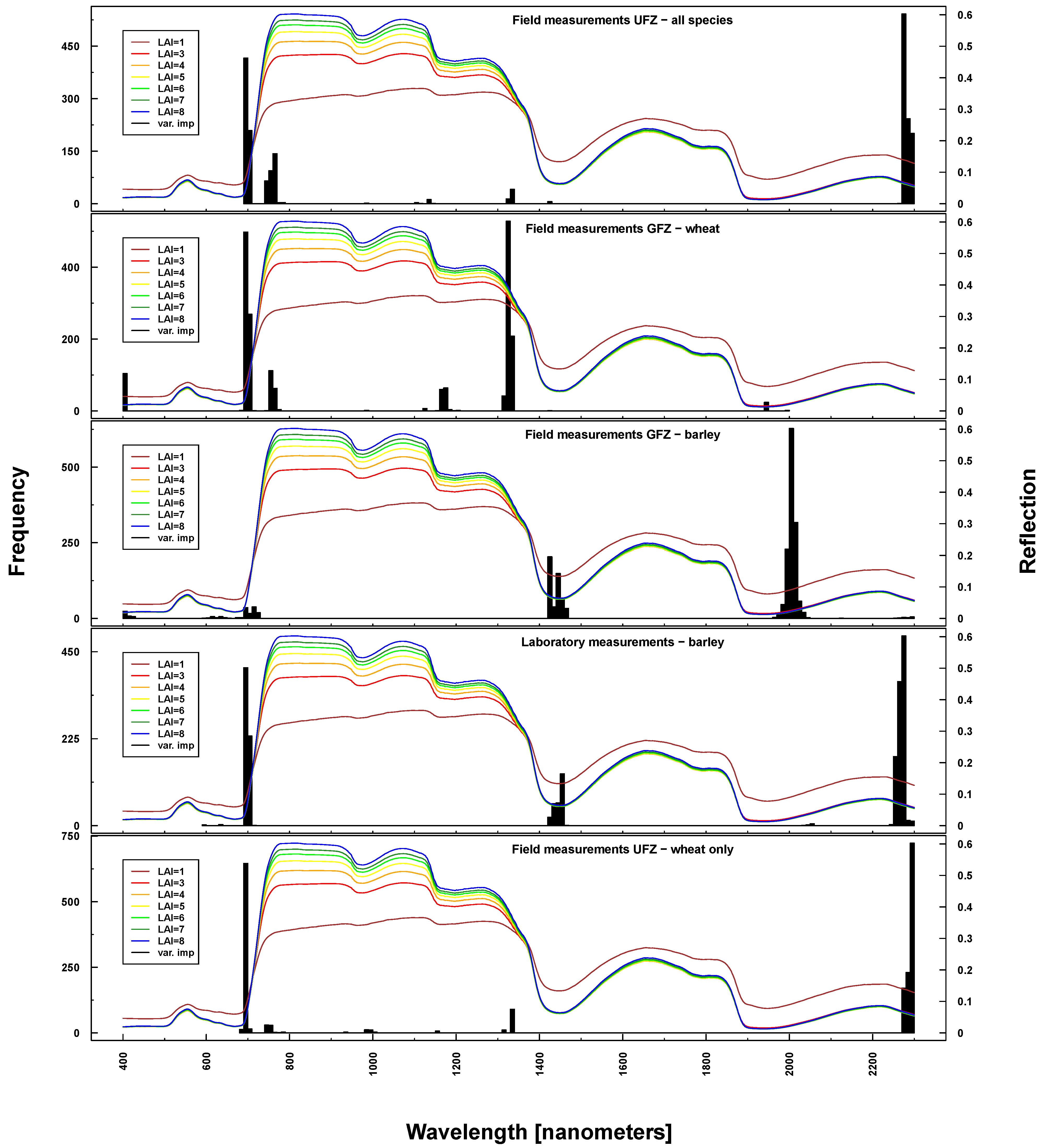 - Variables for predictive RF models were in most cases selected from biophysically meaningful spectral regions. Wavelengths selected for LAI prediction do vary more because changing LAI affects a considerable part of VNIR and SWIR, even extending into VIS at low LAI values.