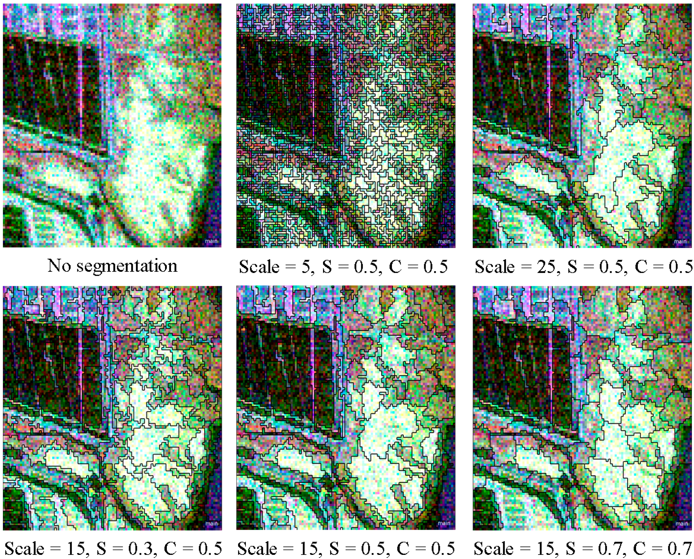 Too many layers in the segmentation can greatly increase the computations and distort the segmentation performance. As noted, a Pauli RGB image can represent all polarimetric information embedded in polarization measurements and retain subtle details in the features; thus, this image is always employed when qualitatively interpreting the physical meanings of the land cover. Therefore, we opted to employ the Pauli RGB image for segmentation. Each channel of the Pauli RGB image was equally weighted during the segmentation, as they were equally sensitive to the three scattering mechanisms.