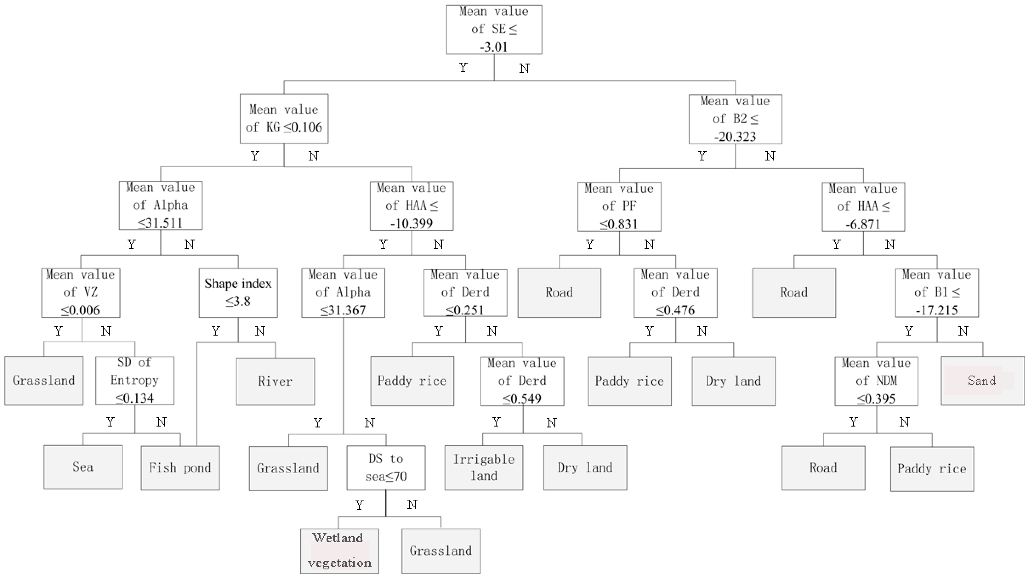 Shannon entropy is a measurement that was introduced by Morio et al. []; it is the sum of two contributions related to intensity and polarimetry. The intensity contribution depends on the total backscattering power, and the polarimetric contribution depends on the Barakat degree of polarization. The training samples could be classified into two groups by the mean value of the Shannon entropy with a threshold of −3.01. Crop fields that are near water bodies could not be differentiated from water. Corresponding to the contribution of the di-plane component in the Krogager decomposition [], the mean value of Krogager_Kd was helpful in distinguishing water bodies and vegetation. In the right branch of the mean value of Krogager_Kd, vegetation could be identified, as it had stronger double-bounce scattering (trunk-water or trunk-ground backscatter) than the water bodies in the left branch. Representing the averaged scattering mechanisms from surface scattering to double-bounce scattering, the mean value of Alpha with the threshold of 31.511 was used to divide the water bodies into two groups. The left branch included grasslands and water, the dominant scattering of which should be single bounce. However, the trails across fish ponds presented a slight volume scattering. Thus, the mean value of VanZyl_Vol could be used to distinguish water bodies from nearby grasslands. The entropy (H) represents the randomness of a scattering medium, from isotropic scattering (H = 0) to totally random scattering (H = 1) []. For smoother surfaces, such as the ocean, surface scattering dominates and H is near zero. As mentioned, fish ponds presented a slight volume scattering in this study area, so compared with the sea, fish ponds had higher entropy values. The standard deviation of entropy is calculated from the entropy and is more sensitive to the variation in surface roughness. Thus, the standard deviation of entropy was helpful in further classifying the sea and fish ponds. With a relatively compact shape, a fish pond could be easily distinguished from a river by using the shape index. The mean value of Alpha and the distance to the sea could successfully differentiate herbaceous wetland vegetation from artificial grasslands. According to knowledge, wetland vegetation grows on the coast near the sea, and the artificial grasslands are located on farms far from the sea, so the distance to the sea can be regarded as an important spatial indicator to reduce the confusion between artificial grasslands and wetland vegetation. When the distance between an object and the sea was less than 70 pixels, the object was regarded as wetland vegetation; otherwise, the object was grassland. The double-bounce eigenvalue relative difference (Derd), which was introduced by Allain et al. [], is very sensitive to surface roughness. In the study, the mean value of Derd was used twice to classify paddy rice, irrigable land and dry land, all of which had similar dominant scattering mechanisms, but different surface roughness.