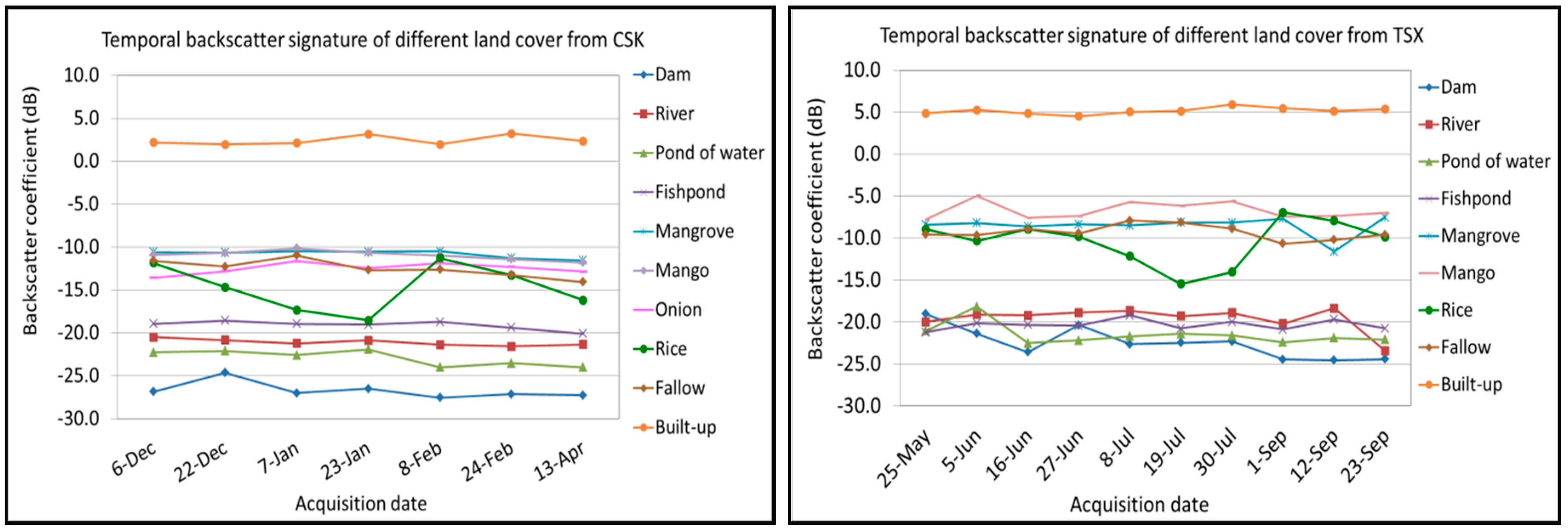 3.2. Temporal Rice Backscatter Signature from TSX and CSK ScanSAR and Threshold Selection