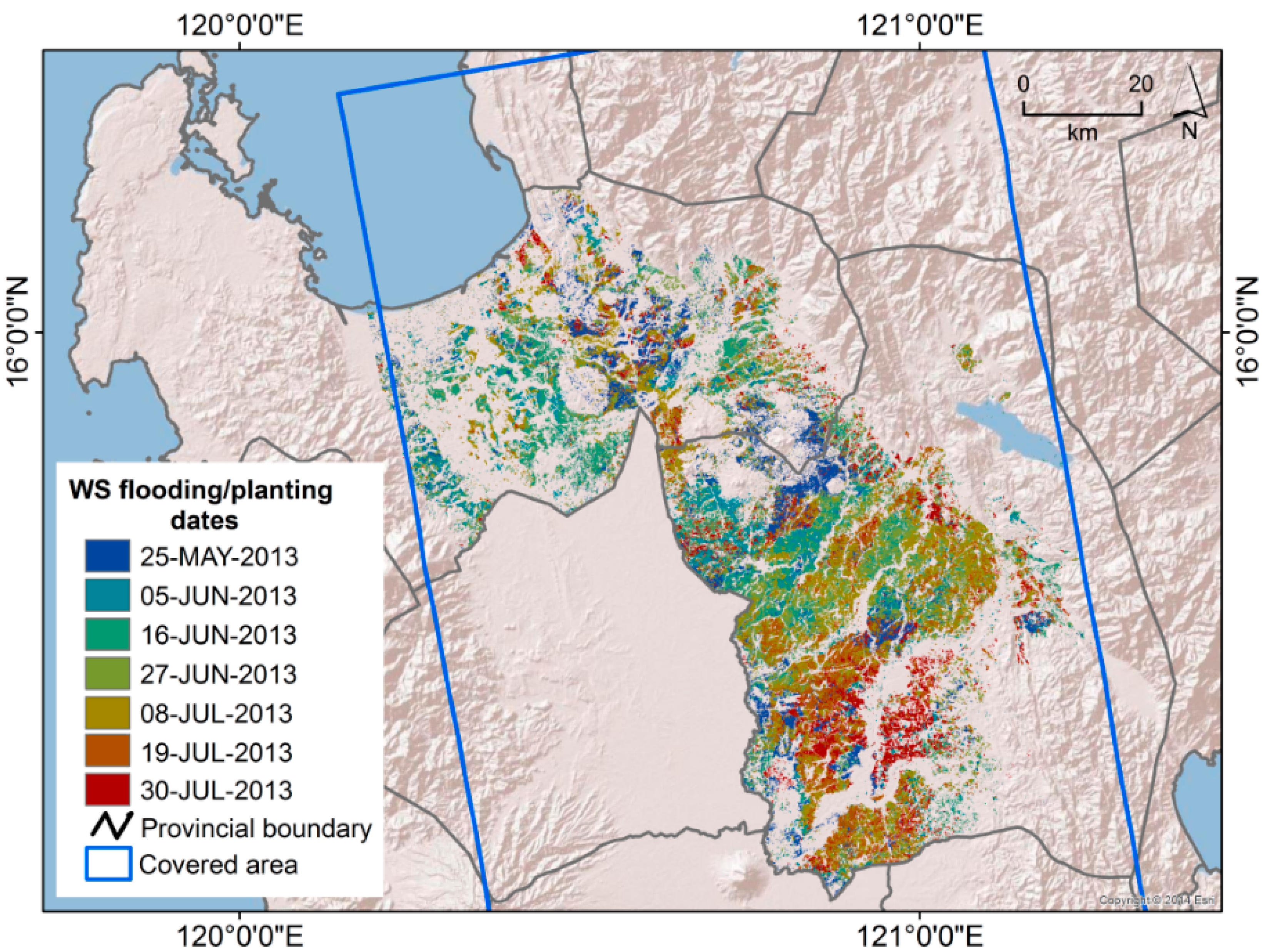 3.3. SAR-Based Rice Cropped Area and Flooding/Transplanting Dates Map (TSX and CSK ScanSAR)