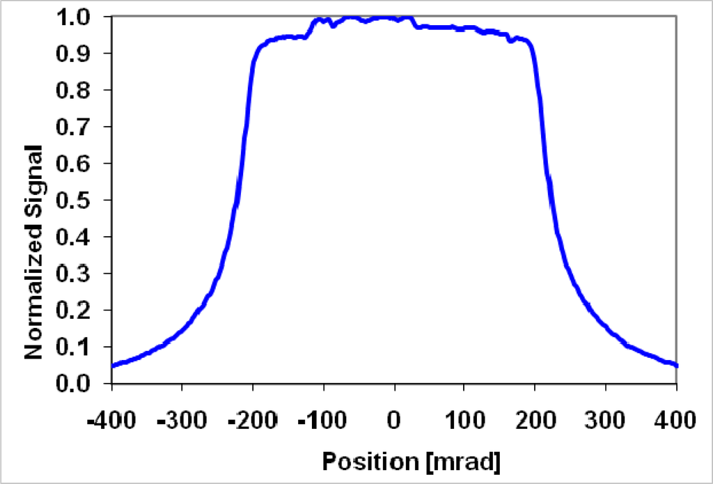 The first calibration problem in this process is the non-uniform sensitivity of the FOV. When a point source is measured, the signal has some (spectral and amplitude) dependence on the position of the source inside the FOV of the bare fiber [6,7]. When this point source is measured with collecting optics, this non-uniformity becomes extremely large due to the focusing of the source on different fibers in the bundle that contribute to different parts of the detector. We measured the FOV of a bare fiber used in an ASD spectrometer by recording the transmitted signal as a function of the angular position of the fiber. A distant QH lamp (point source) illuminated the bare fiber through a scanning flat mirror. As a result the turning of the mirror placed the source at different positions across the fiber’s FOV. Results showed that it has a field of view (FOV) of 400 mrad (this value should be compared with the FOV defined by its Numerical Aperture = 0.22 that predicts a FOV of 25° = 436 mrad) with a fairly flat response (Figure 1). The bare fiber ends with a FOV limiter in all subsequent calibrations, thus providing an ideal angular flat response. The FOV limiter is a black-coated, custom-made metal cylinder that has a limiting iris at its end. In our tests, we used a FOV limiter of 103.6 mrad = 5.9° (Figure 2A). The sensitivity of the bare fiber within this limiting aperture is fairly uniform. On the other hand, when a uniformly illuminated background is measured, the use of the collecting optics is recommended since every fiber in the bundle will be equally irradiated.