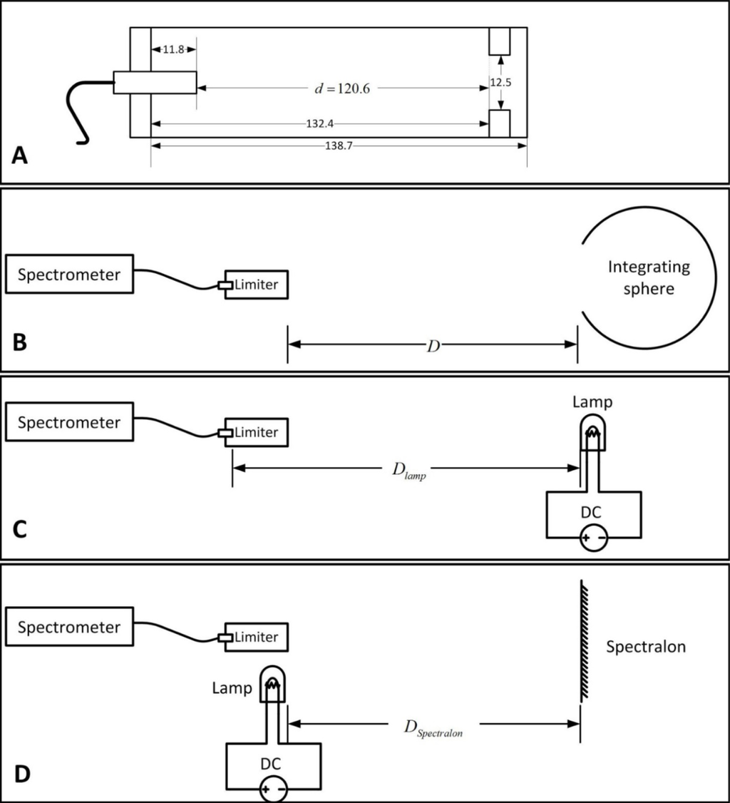 Schematic drawing of the measurement equipment: (A) Blowup of the field of view (FOV) limiter. The bare fiber is attached to the left end of the cylinder. Measurements are in mm; (B) The spectrometer attached to the FOV limiter is aligned in front of an integrating sphere; (C) The spectrometer attached to the FOV limiter is aligned in front of the QH lamp operated by a stabilized direct current (DC) source; (D) The spectrometer attached to the field of view (FOV) FOV limiter is aligned in front of Spectralon panel. An incandescent lamp operated by a stabilized current source is placed near the FOV limiter aperture in front of the Spectralon panel.