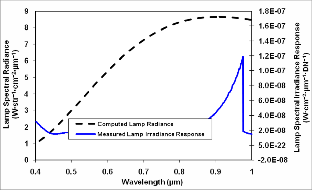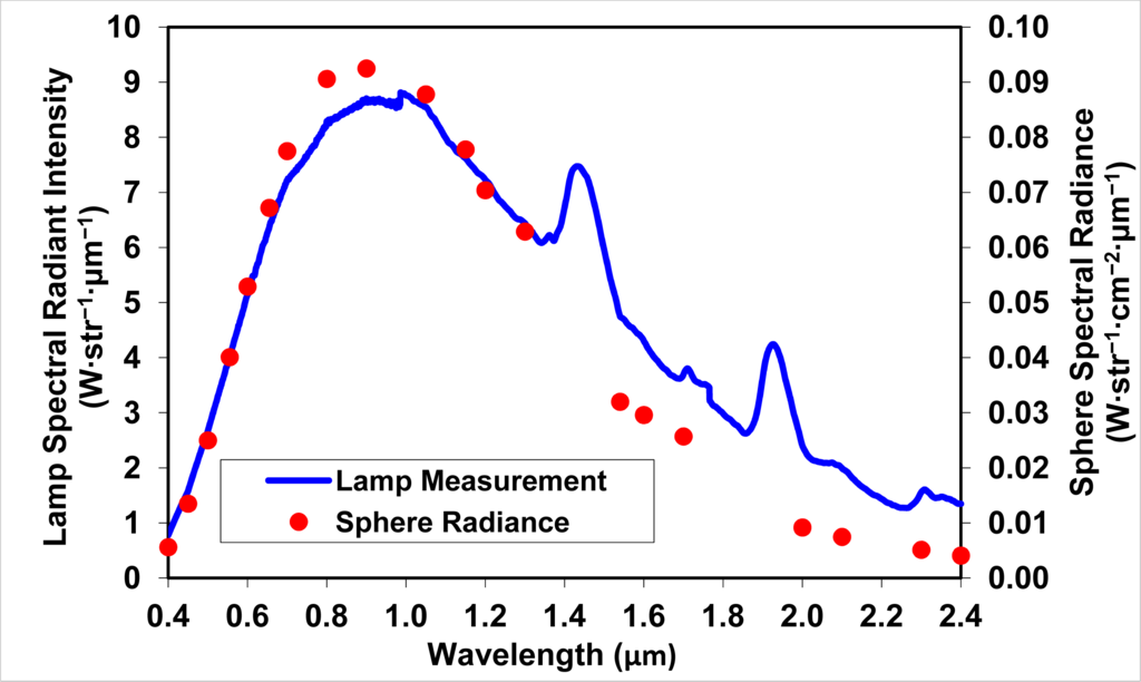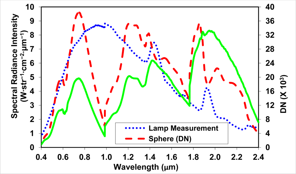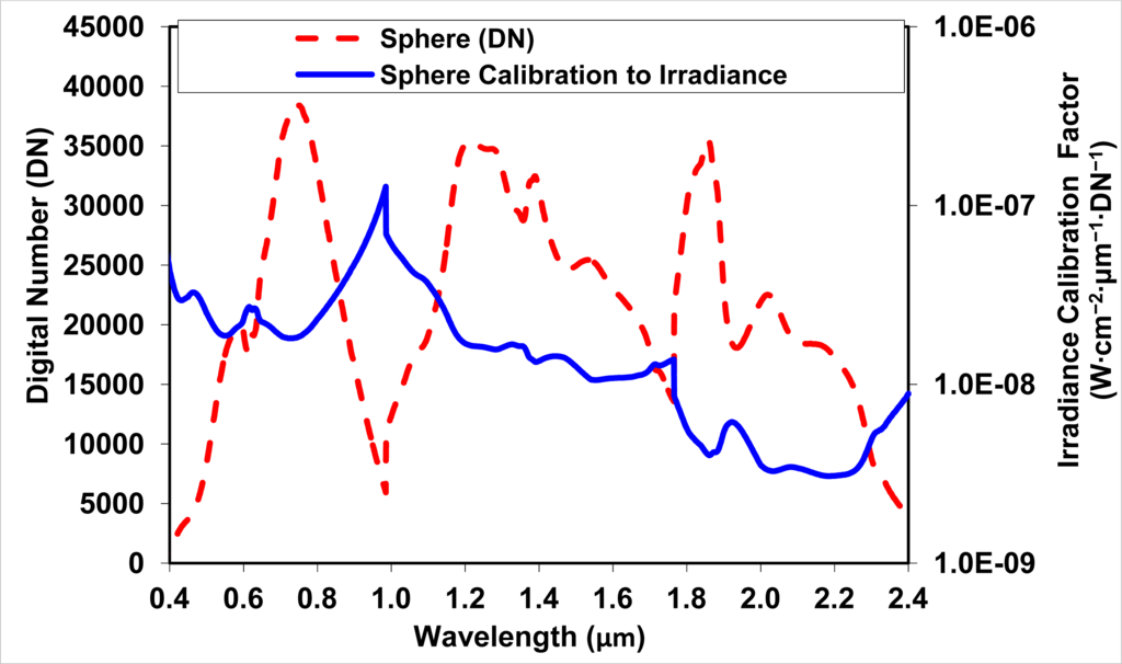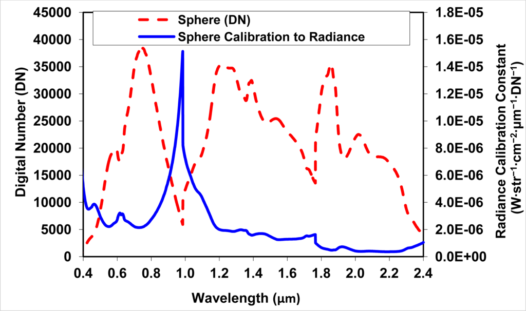The calibrated value of the spectral radiance of the integrating sphere Lsphere (W·str−1·cm−2·μm−1) is divided by the measured signal, DN, to provide the spectrometer radiance calibration factor Kradiance (W·cm−2·str−1·μm−1·DN−1):