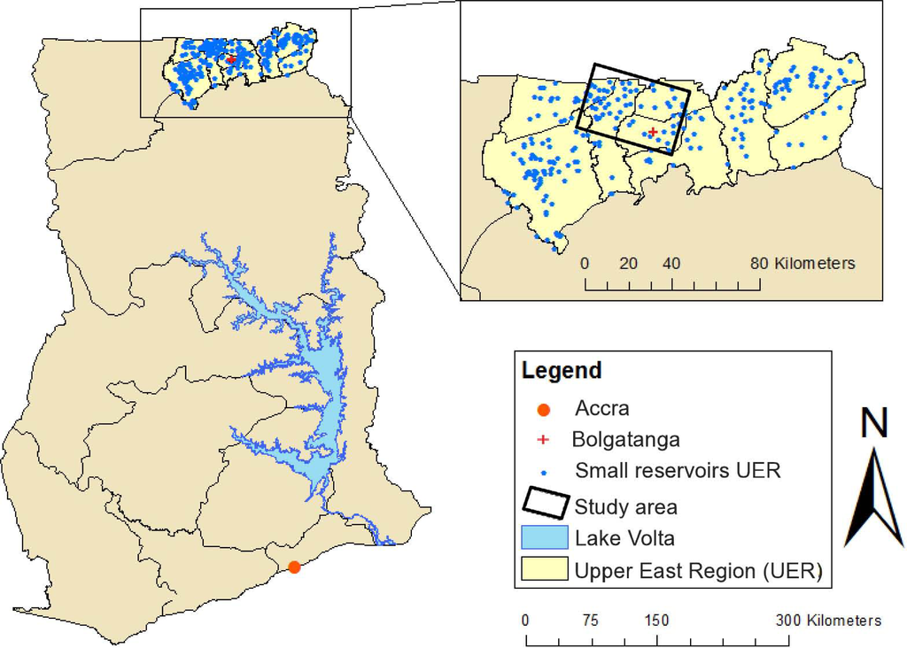 The study area is located in the Upper East Region (UER) of Ghana; see Figure 1. The UER has a semi-arid climate, characterized by a five month, mono-modal wet season and an average rainfall of 1,044 mm/yr over the past 40 years.
