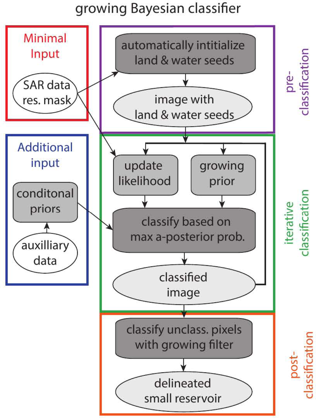 The newly developed growing Bayesian classifier (gBC) [] is used for the delineation of small reservoirs. The gBC classifies a pixel based on the maximum a posteriori probability (MAP), which is calculated from a multivariate Gaussian likelihood function, multiplied by one or more conditional priors. The Gaussian model is justified by the application of the algorithm to logarithmic intensities. In previous work [], it was outlined that the Gamma distribution, typical of homogeneous areas of fully developed speckle, tends toward a log-normal behavior for an increasing number of looks. The multivariate likelihood function exploits information contained in multi-polarized SAR imagery, while the conditional priors update the likelihood with auxiliary information. The basic gBC makes use of one conditional prior, the so-called growing prior, which includes information about neighboring pixels in the classification. The gBC can readily be extended with auxiliary information, e.g., temporal information, in the form of a conditional prior, according to the principle of naive Bayesian image classification [,]. Contrary to traditional maximum likelihood, the gBC does not require a priori training data to calculate the classes’ signatures. Instead, signatures are developed during the iterative classification procedure based on the growing land and water seeds. The gBC flow scheme is given in Figure 2.