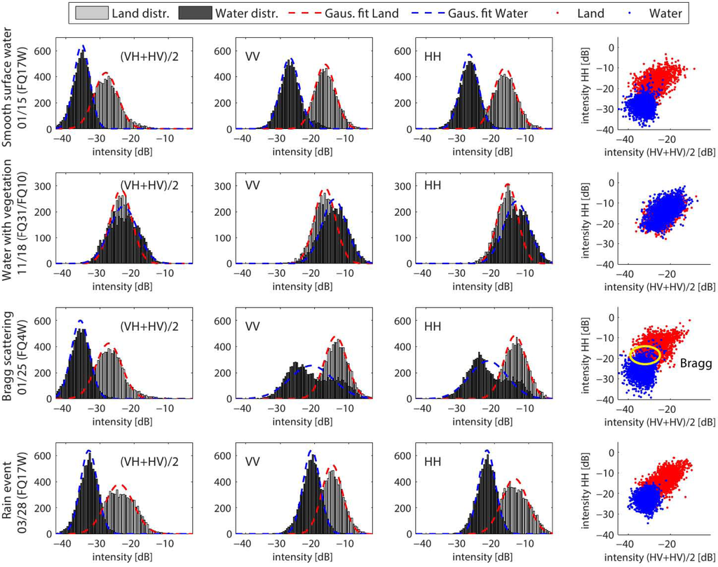 Backscatter intensity distributions and scatter plots for the land and water classes from the samples of four distinct small reservoir backscatter scenarios, i. e., smooth open water, water with vegetation, Bragg scattering and backscatter during a rain event.