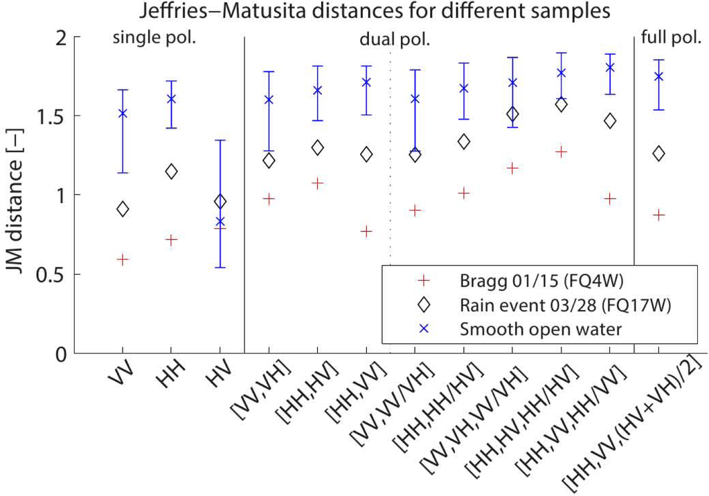 Jeffries-Matusita (JM) distances for the samples of three distinct backscatter scenarios from small reservoirs, where the error bars show the mean, minimum and maximum JM distances from the different samples.