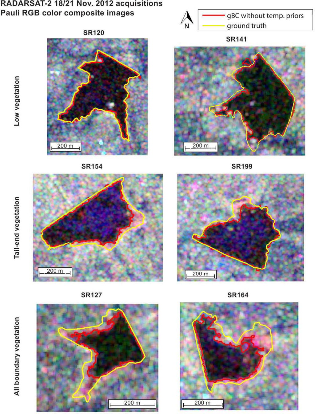 Ground truth (yellow line) and delineation (red line) based on the ‘HH, HV’ polarization combination overlaid on Pauli RGB-images, with red colors for double bounce, green for volume scatter and blue for single bounce; note that the different color scales are used for the different Pauli components to enhance the image contrast.