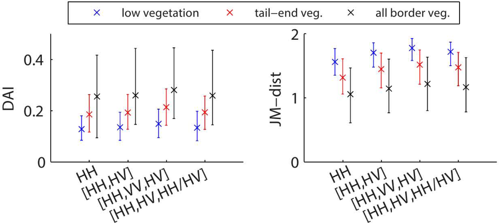 The results are summarized in Figure 6 with the Differential Area Index (DAI), as used by [], and the JM distance based on the ground truth. The figure shows an overall underestimation of the classified small reservoir area. Compared to the ground truth, an underestimation of 12.8% to 14.8%, depending on the polarization combination, of the small reservoir area is found for small reservoirs with low vegetation. This underestimation is larger for the classes with more vegetation. The error made for delineating open water is expected to be smaller than suggested by these numbers, as the underestimation is due to different classification errors and a bias towards the land in the ground truth. First of all, there is an error due to vegetation in the small reservoirs, even in the reservoirs with ‘low vegetation’; see, e.g., SR141 in Figure 5, where some trees within the reservoir cause an incorrect classification at the tail-ends. A smaller error is due to the moving average filter, which reduces noise, but might also cause some boundary pixels to be classified as land instead of water. Furthermore, there is an error in the ground truth from the inaccuracy of the GPS device. The ground truth also shows a bias towards the land, due to the fact that the measurements were all taken while walking around the reservoir as close to the land-water boundary as possible, but on the land side. The JM distances show a clear trend between the increase in vegetation in the small reservoir and a decrease in separability. This is due to the increasing confusion area with an increasing vegetation area in the small reservoir.