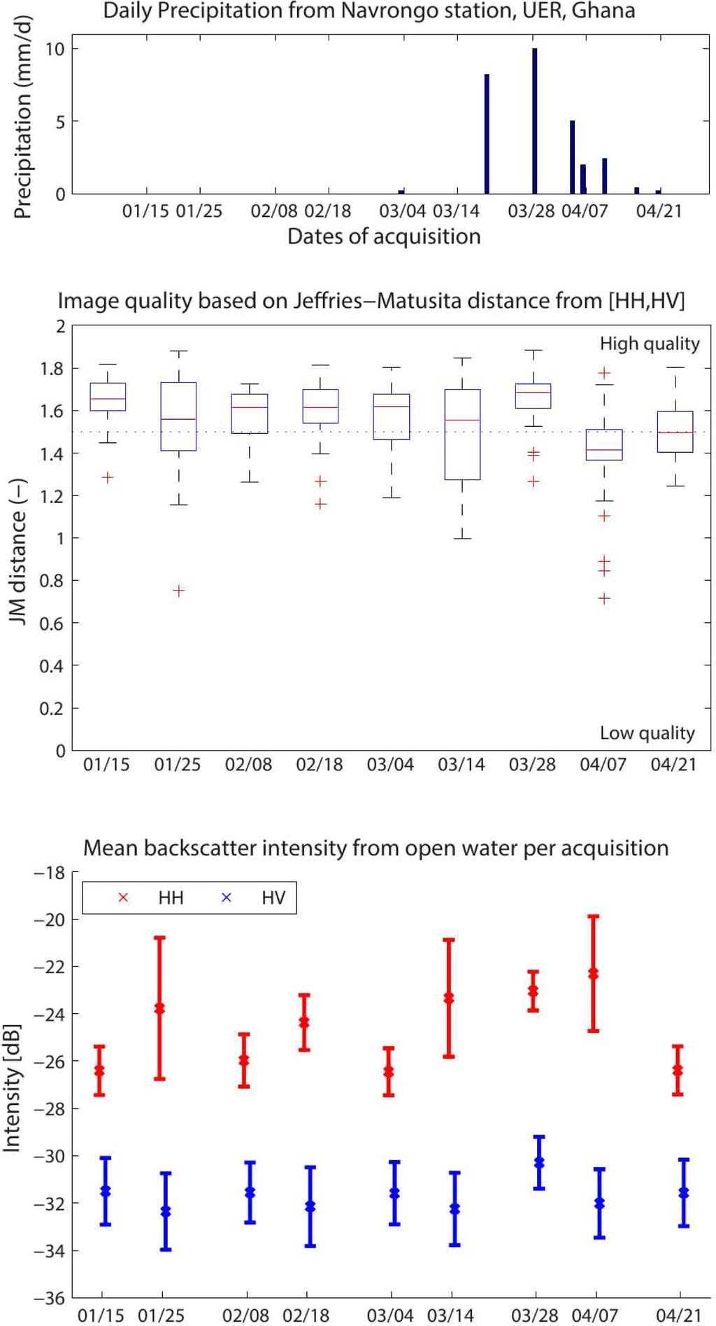 Rainfall time senes (top), the quality of an acquisition based on the Jeffries Matusita (JM) distance (middle) and the mean backscatter intensity of the minimum delineated small reservoir area (bottom), where the boxplots show the median, first and second quartile boundaries and the red crosses are outliers; the error bars show the mean and one standard deviation boundaries.