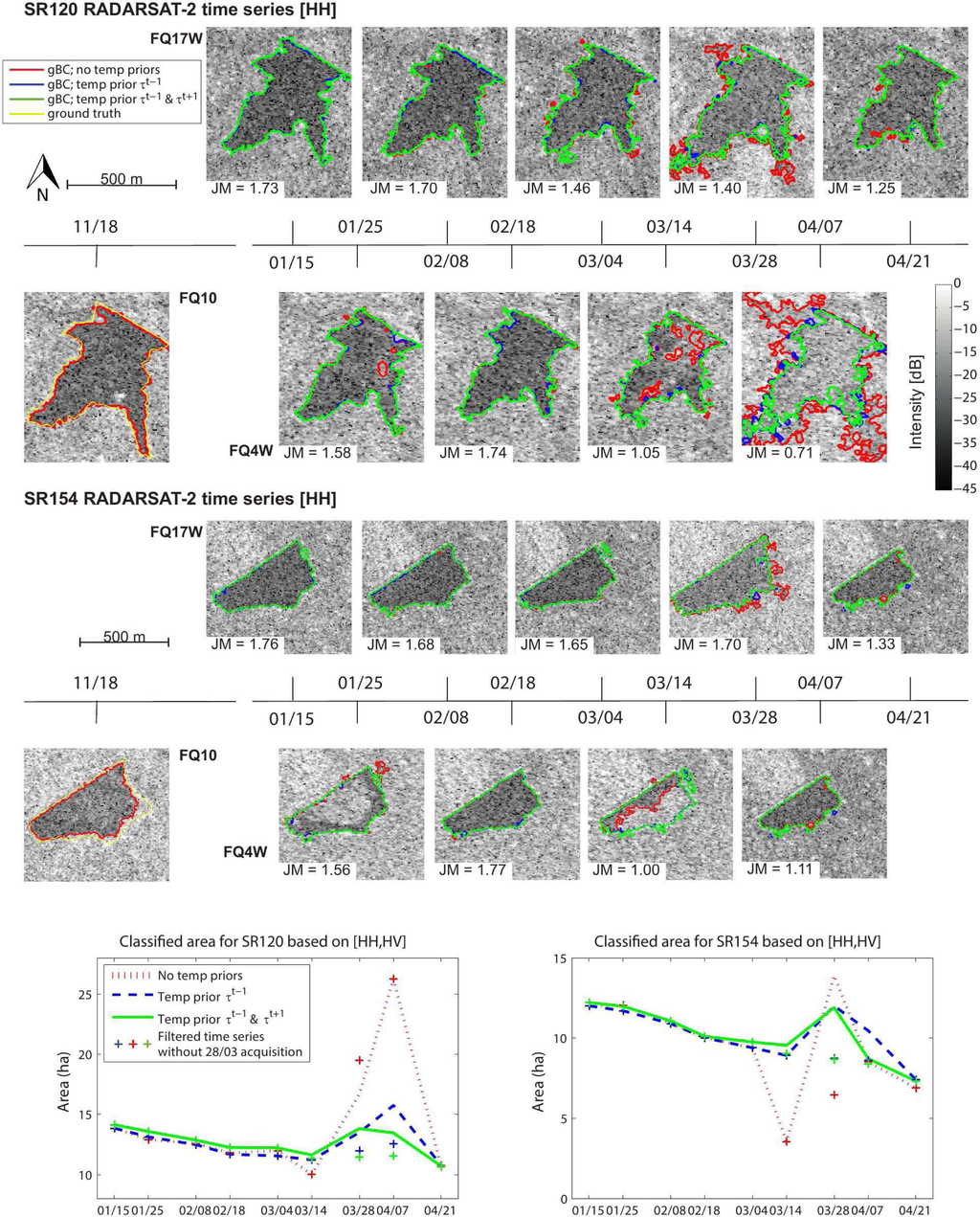 Time series of small reservoir delineation based on the ‘HH, HV’ polarization combination and the basic gBC (red line), the gBC updated with temporal prior τt−1 (blue line) and the gBC updated with both priors τt−1 and τt+1 (green line) overlaid on HH backscatter intensity images; the bottom graphs show the areal variation in time for the same reservoirs, where the crosses show the filtered time series without the rain-affected March 28 acquisition.