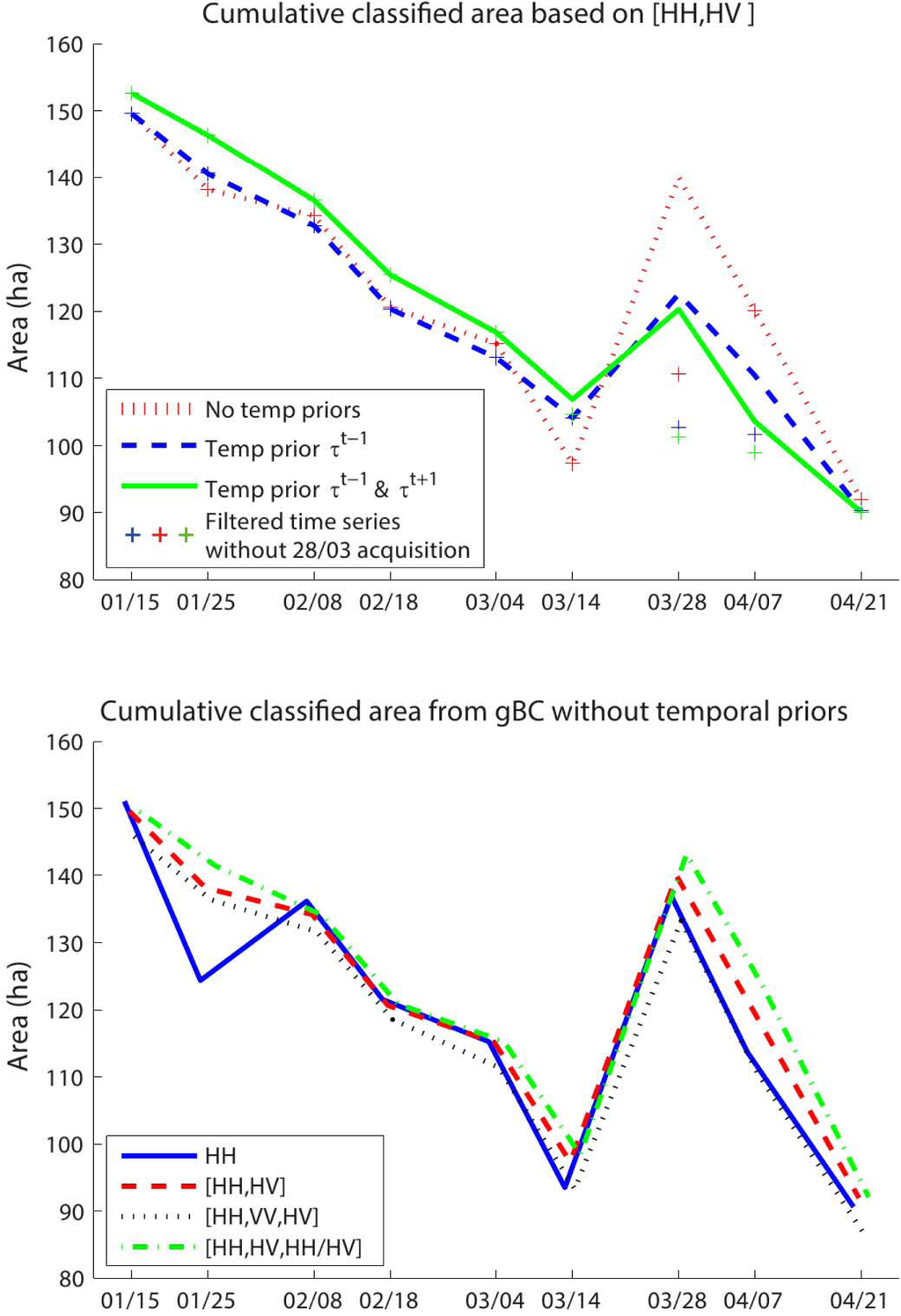 Time series of the cumulative classified area for 26 small reservoirs, based on the growing Bayesian classifier (gBC) with and without temporal priors (top) and the gBC without temporal priors for different polarization combinations (bottom).