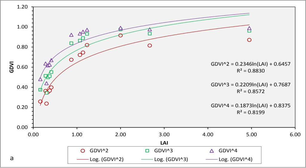 | GDVI^3 = 0.1965ln(LAI) + 0.82 | 0.7600 | |