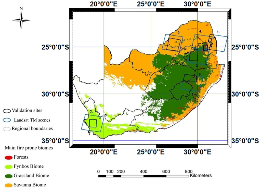 The biome map showing the location of the validation sites and multi-temporal Landsat 5 Thematic Mapper (TM) acquisitions distributed across the four fire-prone biomes in South Africa.