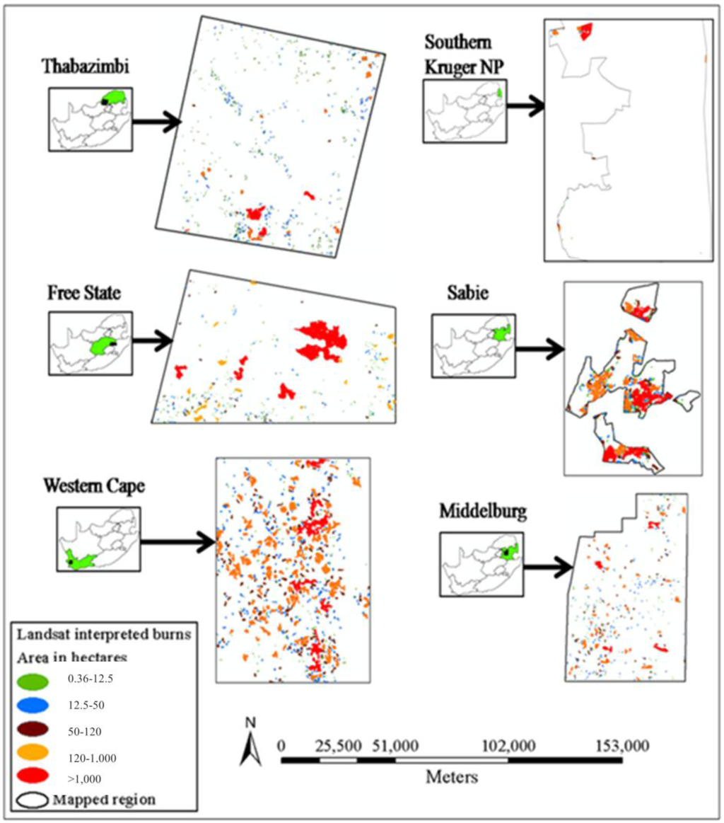 Spatial analysis of the burned areas interpreted and produced from multi-temporal Landsat TM data over the six validation sites. The burned area patterns show a diversity of burned shapes, from narrow and/or fragmented (0.36, 12.5, 50 ha) to large and compact (>1,000 ha).